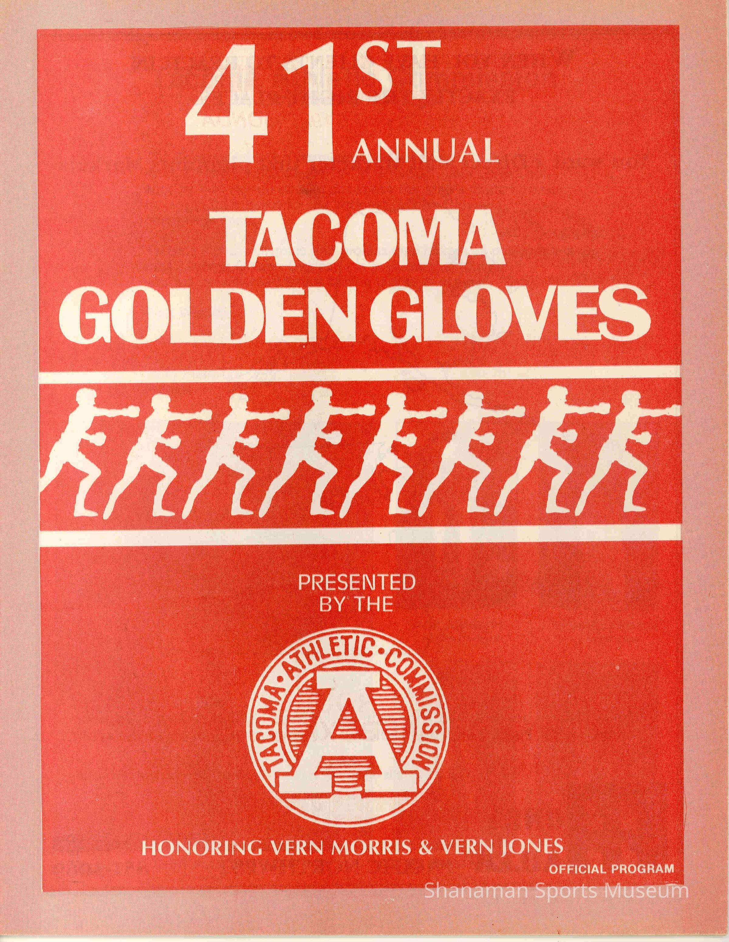 "41st Annual Tacoma Golden Gloves" Printed on newsprint; Cover is bright red with pink borders. Silhouettes of boxers; honors Vern Morris and Vern Jones.