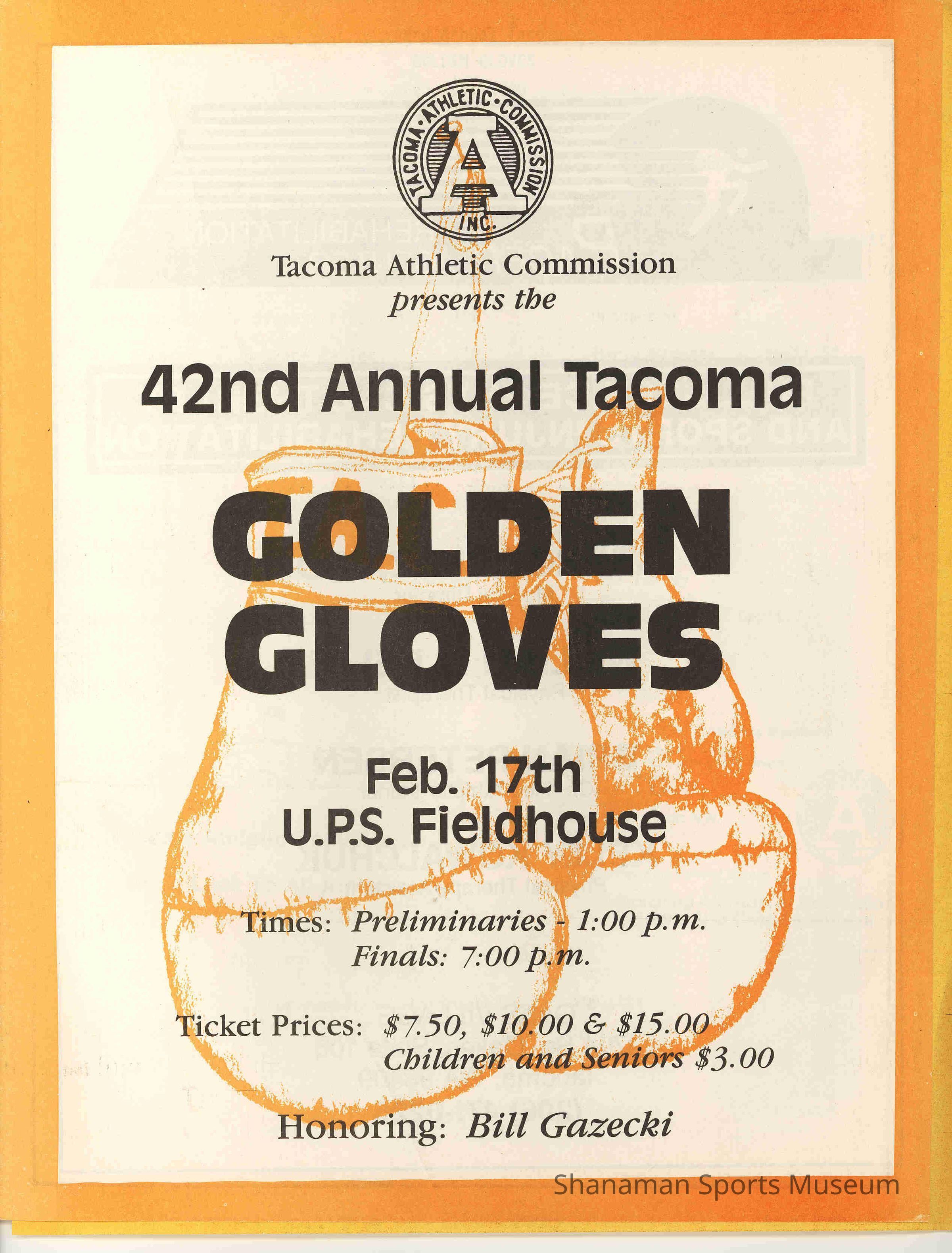 "42nd Annual Tacoma Golden Gloves" Printed on newsprint; A pair of gloves and border of the page printed in bright yellow. Event honors Bill Gazecki