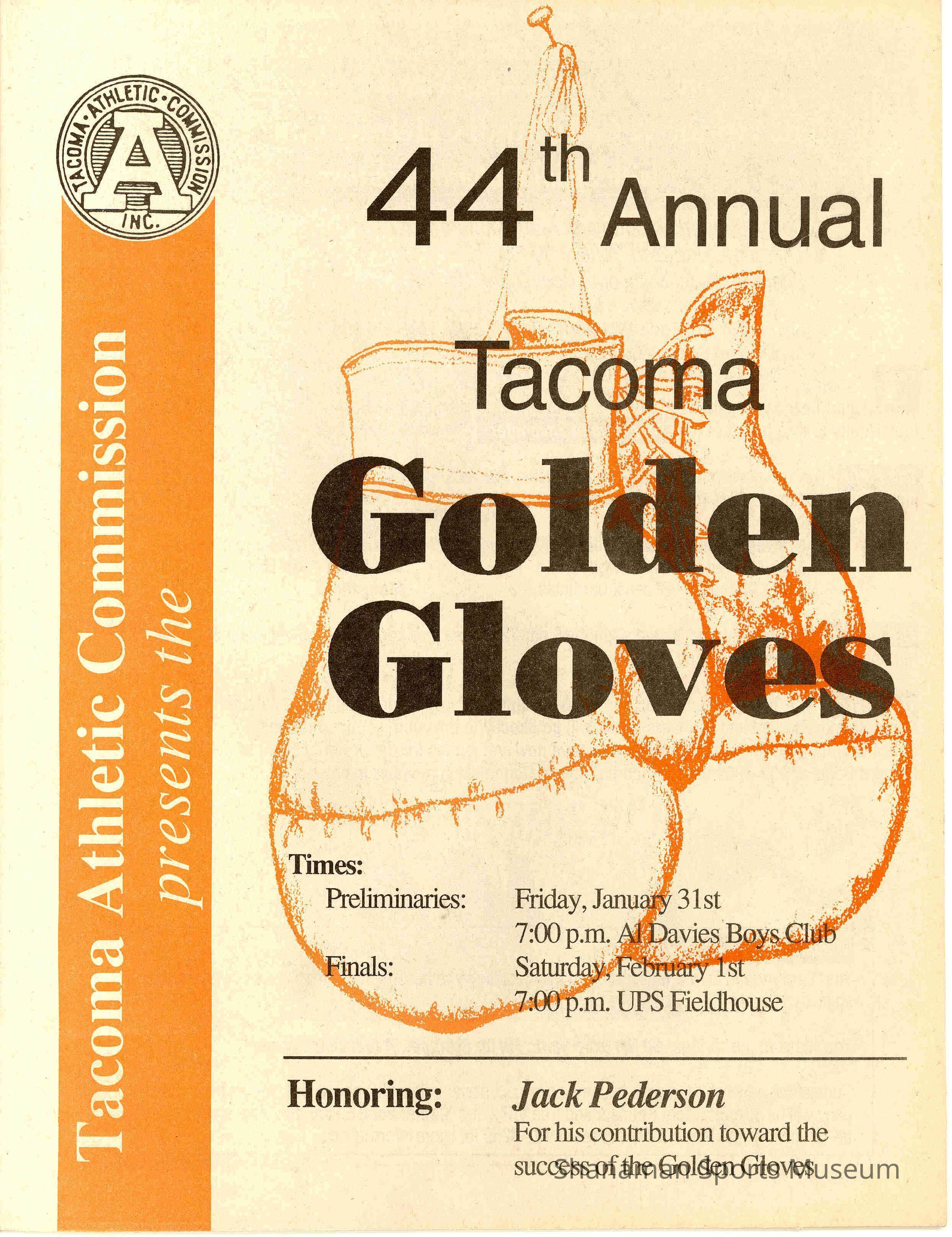 "44th Annual Tacoma Golden Gloves" Printed on newsprint; A pair of gloves and a vertical band on the left side of page is printed in bright yellow-orange.