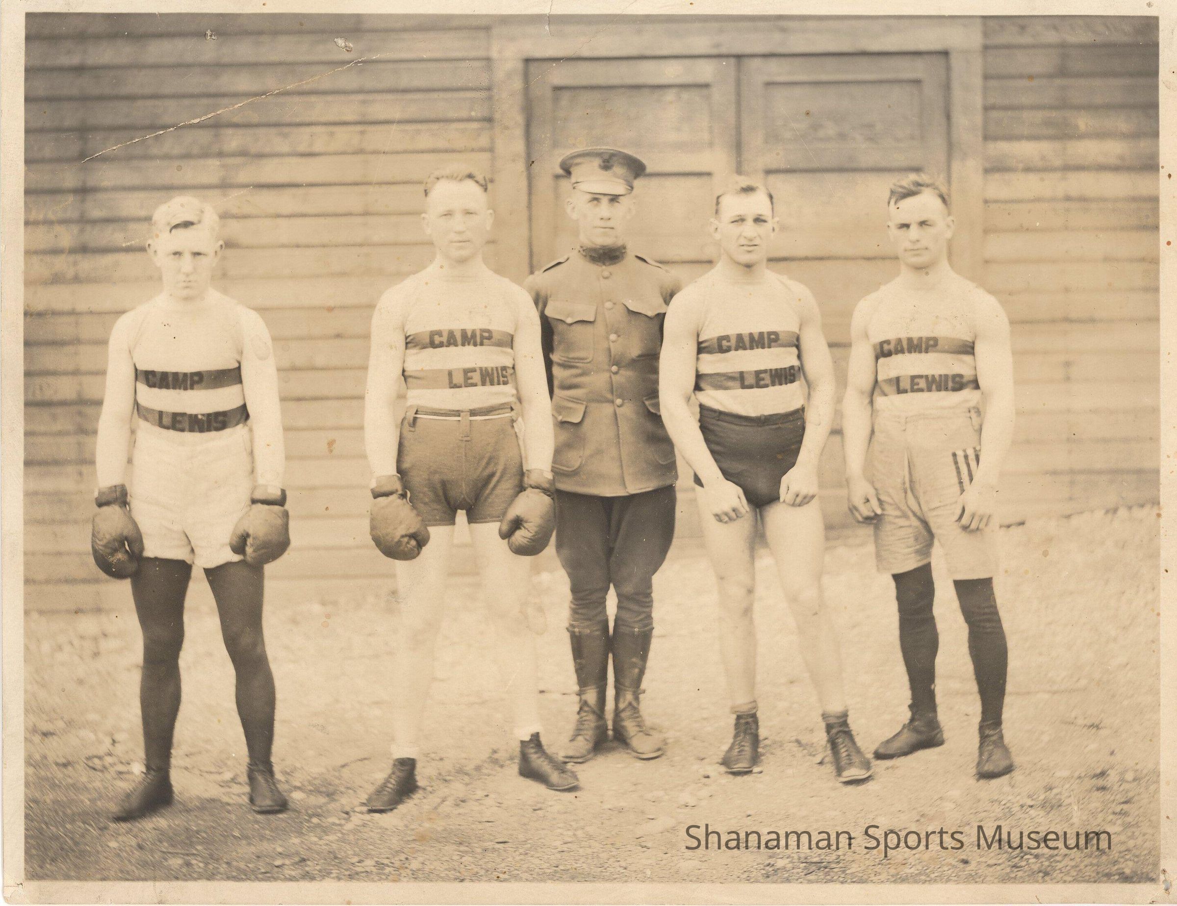 In this black-and-white photo taken around 1920, four soldiers at Fort Lewis, two of them wearing boxing gloves, and a officer in uniform stand together. The photo was donated by Dennis and Jennifer Bullis. Fort Lewis, named after Meriwether Lewis of the Lewis and Clark expedition in 1804, opened in 1917. Sporting events like boxing are supported by Fort Lewis to help soldiers' moral and to help them stay in shape.Made/Created