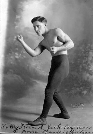 Here is an original print of a boxer posing to fight. On this old black-and-white photo it is signed to Jack Connor from Frankie Williams. Over the years, Tacoma was been home for many successful boxers, amateur and pro. In the 1930s, Freddie Steele was the light middleweight champion of the world. In the 1950s, Pat McMurtry was a heavyweight contender and a popular boxer. In the 1970s, Leo Randolph and Sugar Ray Seals won Olympic gold medals.Lexicon