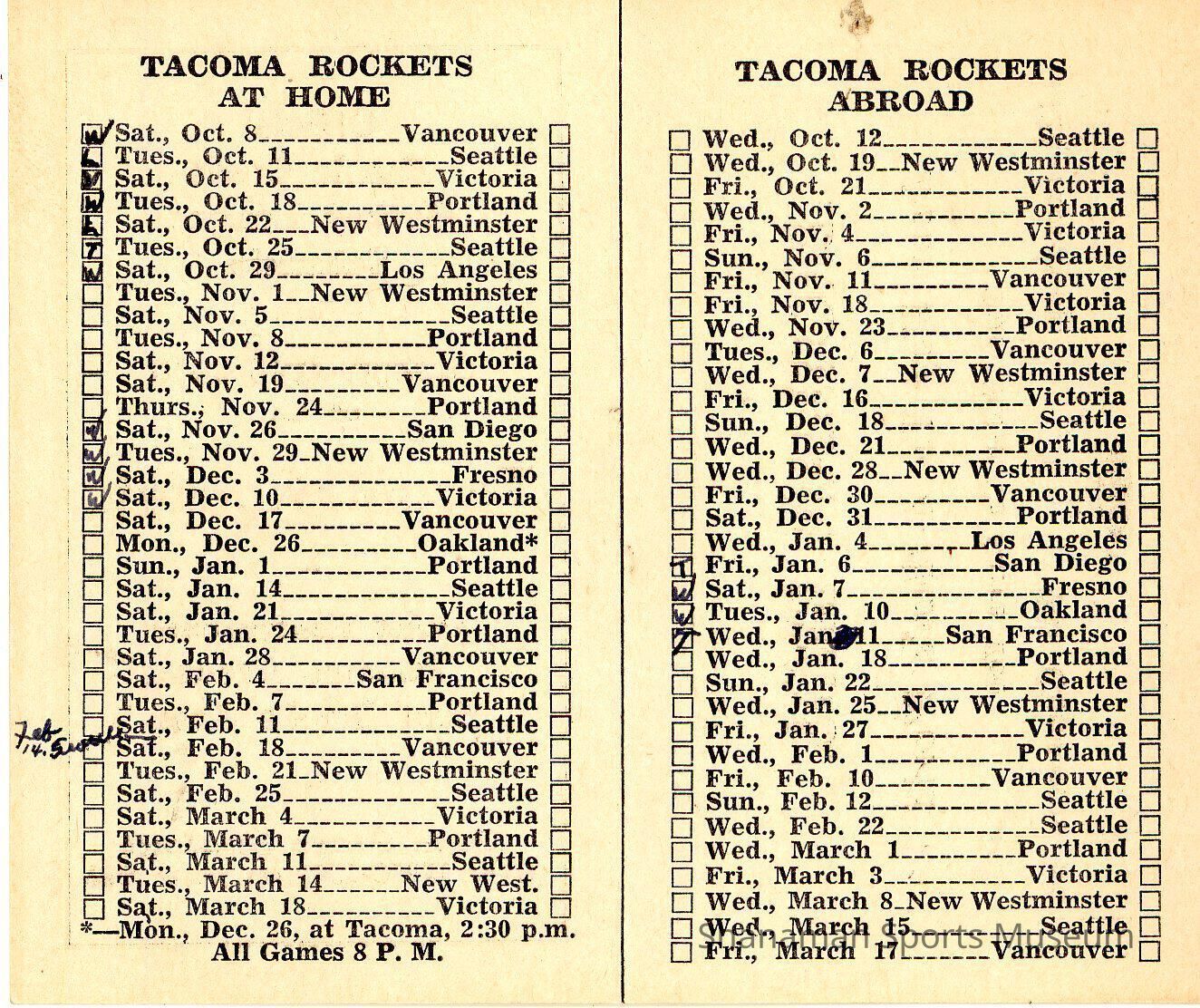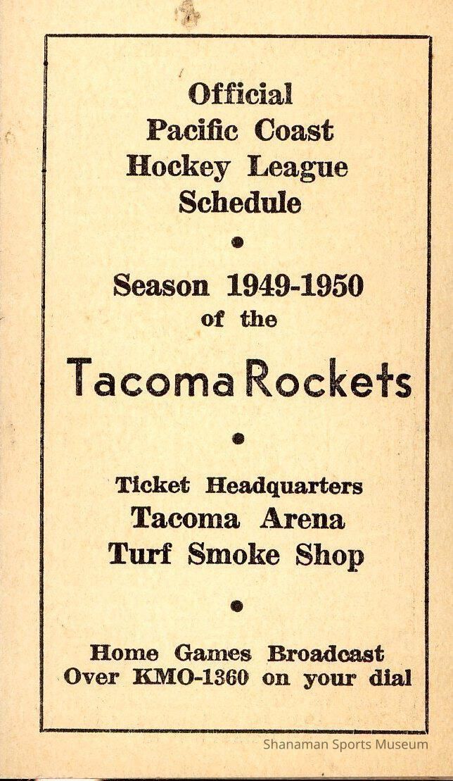 Small pocket schedule for the 1949-50 Tacoma Rockets season. Games broken down "At home" and "abroad". Black printing on white paper.