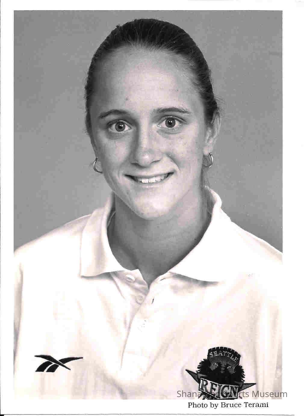 A black and white in-game player portrait of Kate Starbird while she played for the Seattle Reign in the Women’s National Basketball League. Born July 30, 1975 in West Point, New York, the basketball standout reached the highest level of the sport when she was drafted by the Sacramento Monarchs in the third round (26th overall) of the 1999 WNBA draft. Starbird is considered one of the greatest basketball players to come out of the Pierce County area where she starred for Lakes High School and is considered one of the greatest scorers in state history; Starbird scored 2,553 career points over her prep career for 29.3 points-per game and helped the Lancers finish in fifth-place at state during the 1992-1993 season. Starbird was named as a National All-American by the Women’s Basketball Association in 1993 where she was named the most valuable player of the all-star game. She played for Stanford University where she again became the all-time leading scorer, this time for the Cardinals where she set the then all-time mark with 2,215 career points (20.9 points-per game); Candace Wiggins broke Stabird’s career points record on January 31, 2008. She was the College Player of the Year in 1997 while playing for the Cardinals. After college she went on to play in the WNBA playing for Utah, Seattle, Sacramento and Indiana. Starbird spent time playing in Spain in 2004 where she continued her high scoring averaging 18.7 points-per game playing abroad. Starbird was inducted into the Stanford Athletic Hall of Fame in 2007.Lexicon