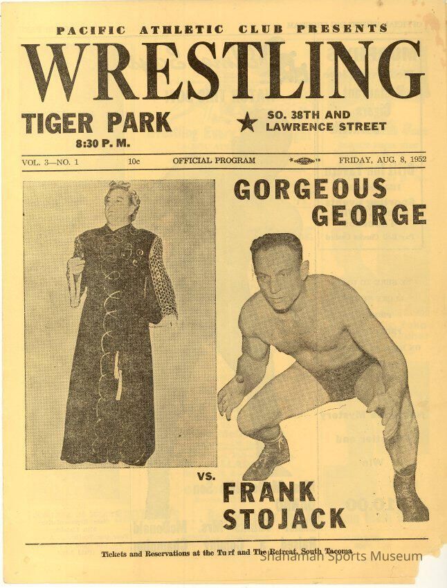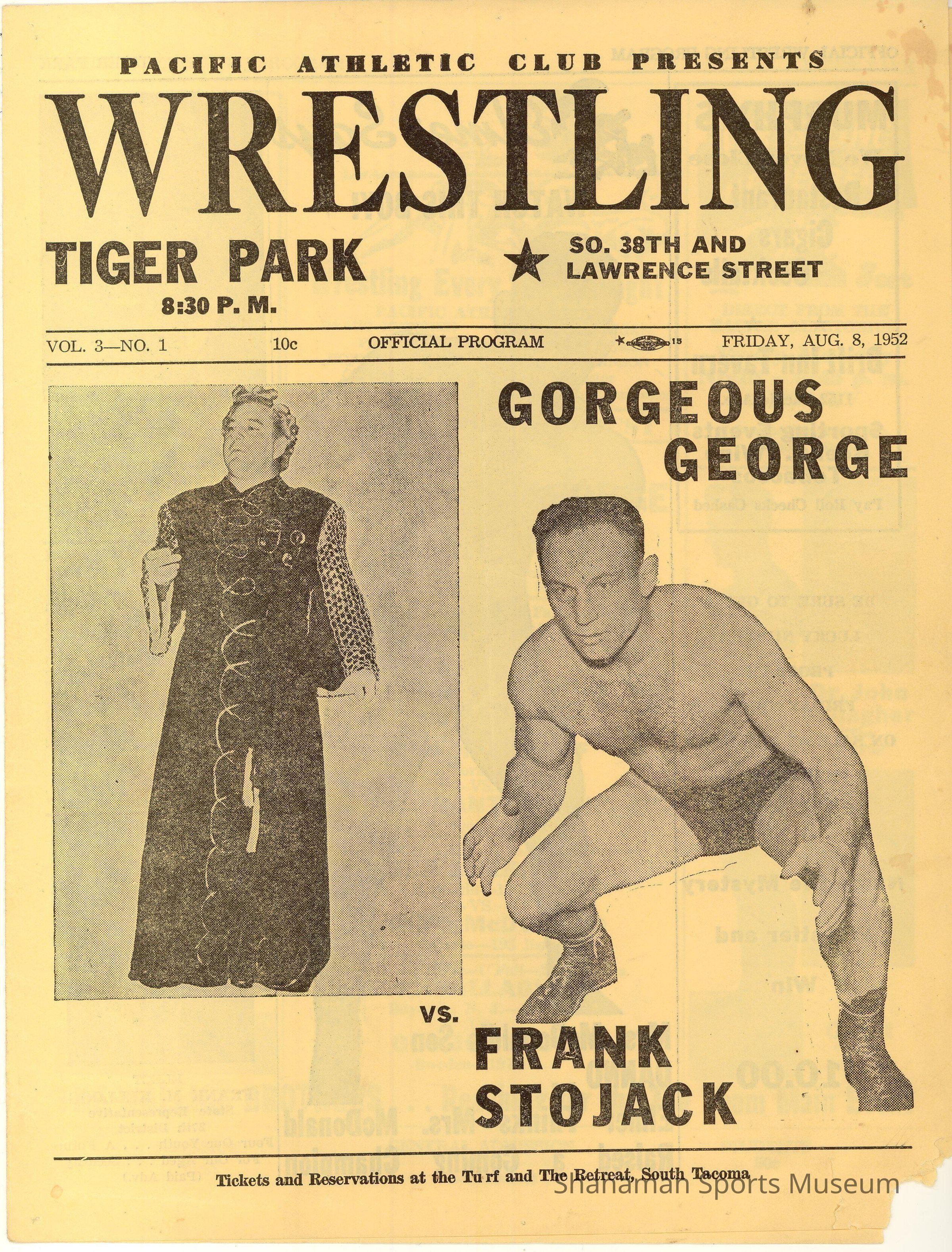 Souvenir program, August 8, 1952 from the Pacific Athletic Club presenting "Wrestling - Gorgeous George vs Frank Stojack"Lexicon