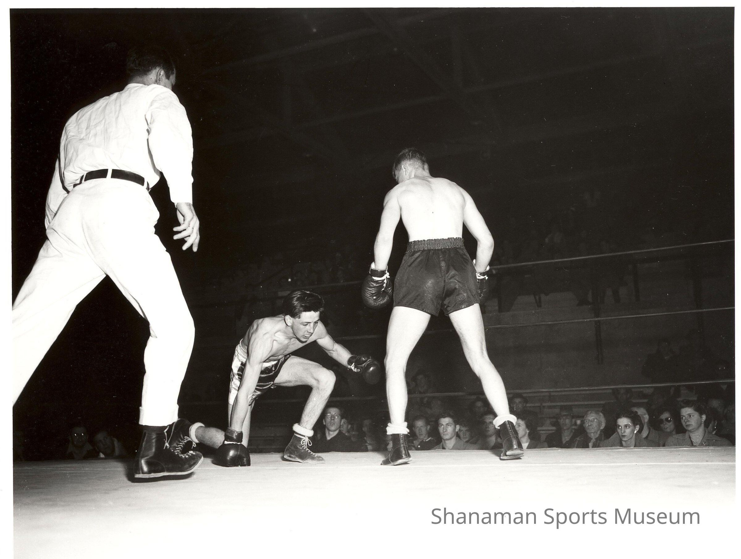 Tacoma's Davy Ward referees this amateur bout between two young boxers. One fighter struggles to get back to his feet after getting knocked down. Ward was a frequent participant in boxing, refereeing fights across the Northwest. He was also there refereeing at the Tacoma Golden Gloves events over the years. Before Ward starting refereeing in 1948, he boxed professionally. He was a protege of Freddie Steele, the world middleweight champ who trained in Tacoma. For some of Ward's first fights, Steele was in Ward's corner giving advice. Ward had boxing in his blood. His father, Jim Ward, had been the light heavyweight champ of Great Britain. Photograph donated by Rhiny Wilhelm.Lexicon