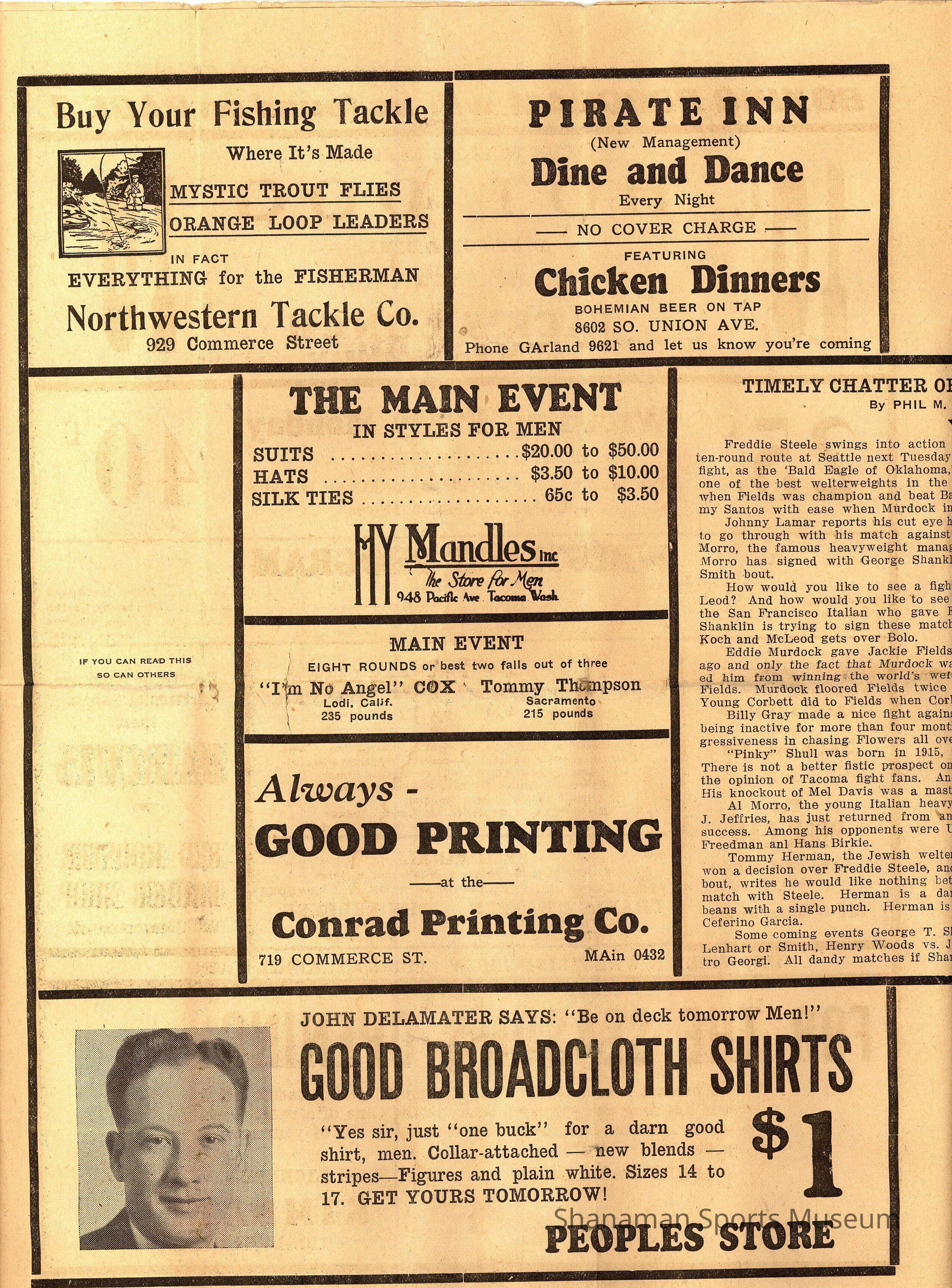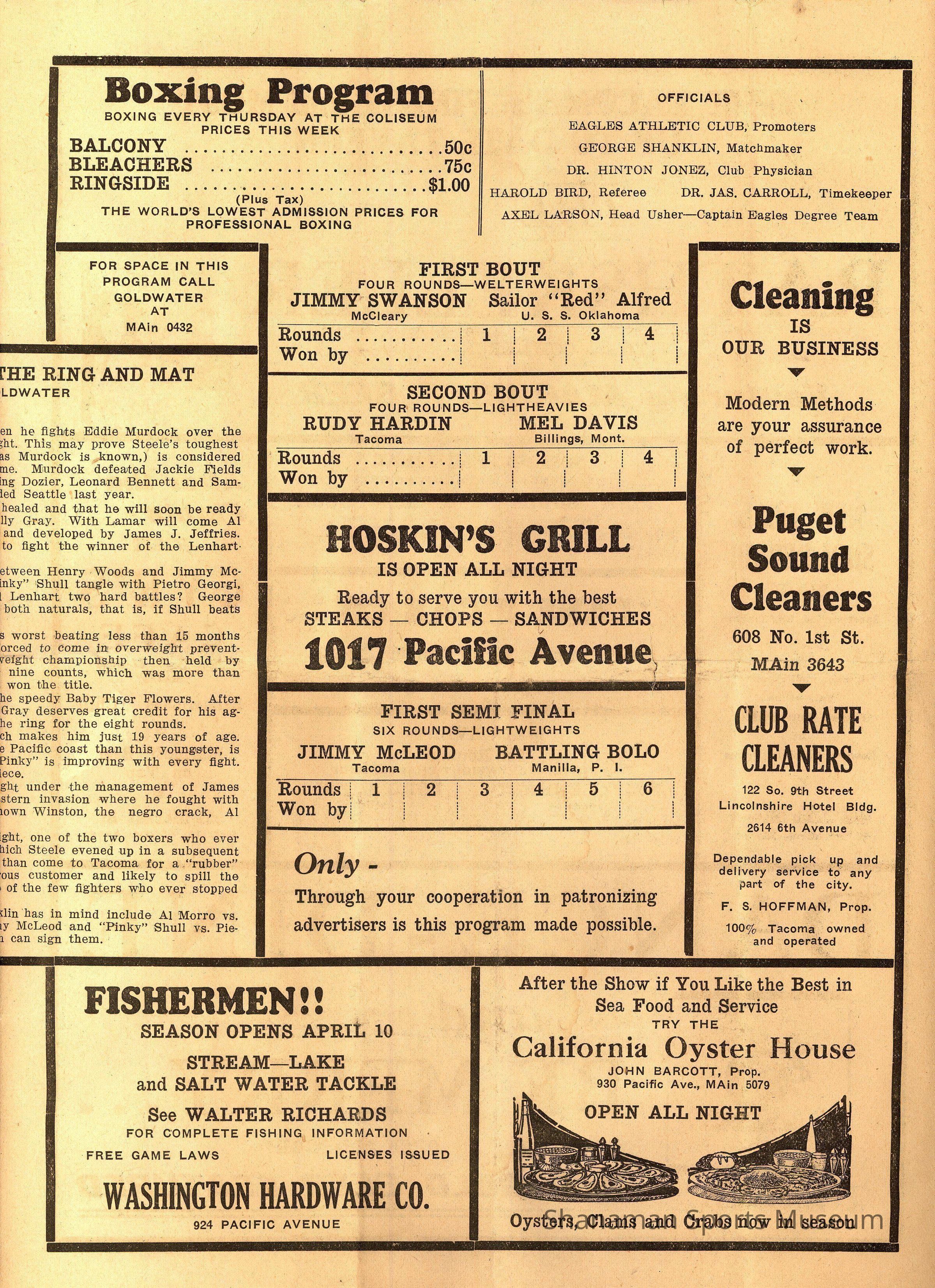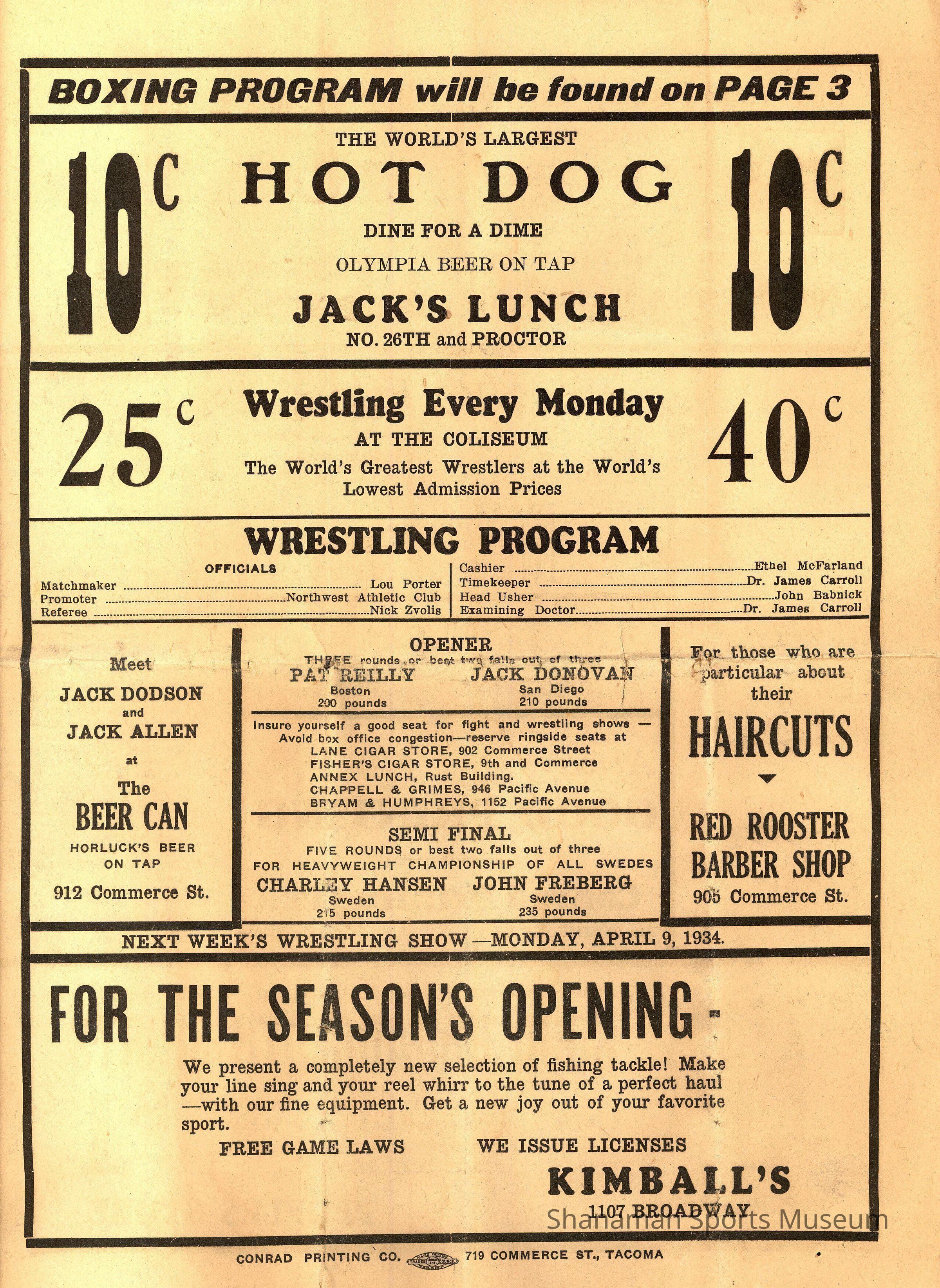 Bifold newsprint flyer publishing the wrestling and boxing program for Tacoma, printed c. 1934.