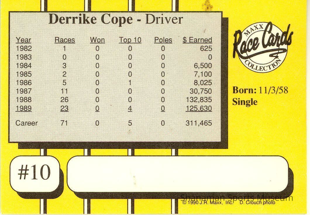 Individual trading card featuring race car driver Derrike Cope from Tacoma. Stored in a plastic sleeve.