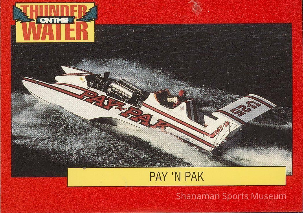 Trading card featuring "Pay-n-Pak" hydroplane racer George Henley.