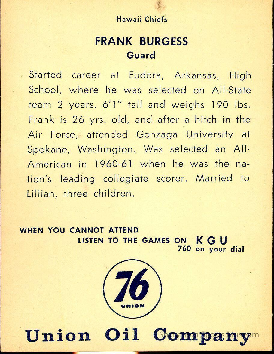 trading card featuring Frank Burgess who played basketball for Gonzaga University