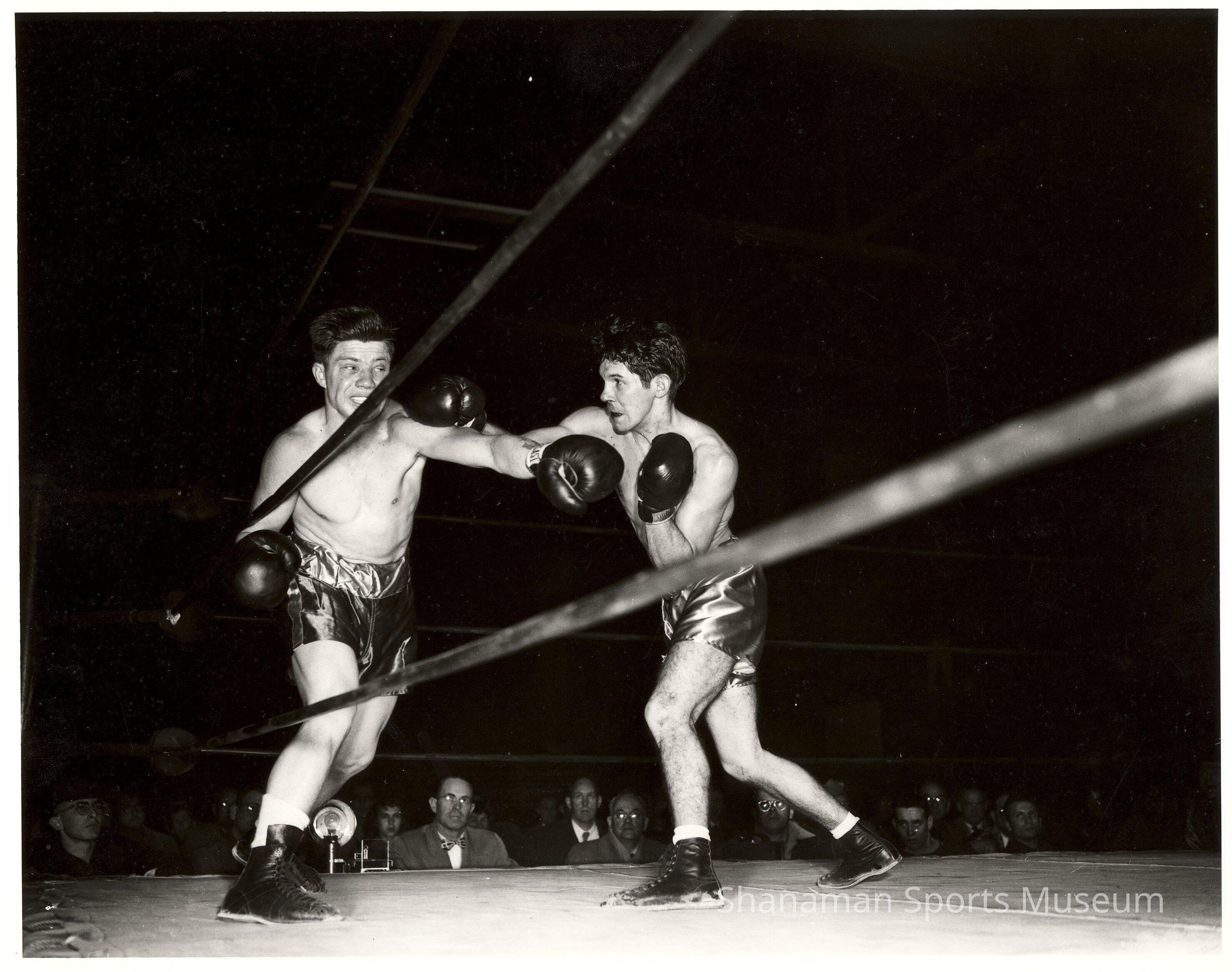 2 unidentified boxers ringside. Dan Walton, Sports editor of the Tacoma News Tribune, watches the Golden Gloves action at the Tacoma Armory. Walton is the 2nd gentleman to the right of the ringside camera. Photographer Rhiny Wilhelm. c. 1949Lexicon