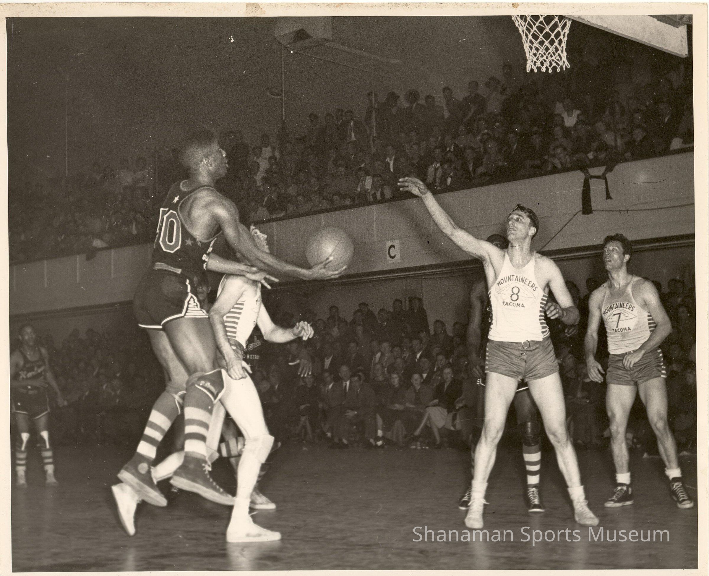 In this black-and-white photo, Ernie Endness (No. 8) and Al Brightman (No.7) of the Tacoma Mountaineers watch a Harlem Globetrotter drive to the basket for a lay-in in an exhibition game played in Tacoma. The Tacoma Mountaineers played in the Pacific Coast Professional League in the 1940s. The Mountaineers were Tacoma's first and only pro basketball team and were led by Tacoma's Marv Harshman and Tom Cross. The Globetrotters started in the 1920s and today travel the world putting on an amusing and athletic basketball game. While parts of these exhibition games are staged, rehearsed and practiced, the outcome of the game is not fixed.Lexicon