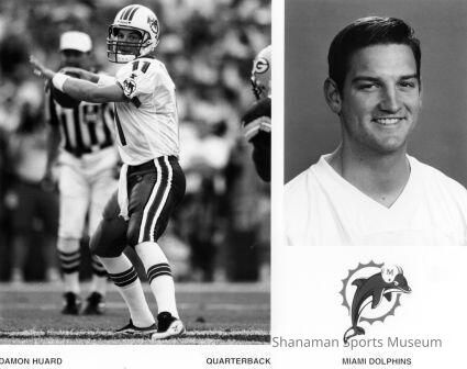 A split black and white photograph of Damon Huard while he was with the Miami Dolphins; top right is a portrait of Huard, left an in-game action shot of him playing, and the Miami Dolphins team logo in the bottom right. Huard had 14 year football career in the National Football League, where he was a part of two Super Bowl championships as the backup to Tom Brady with the New England Patriots in both 2001 and 2003. Huard replaced Billy Joe Hobert at quarterback for the Puyallup High School Vikings, where Huard went on to be named the Powerade State Player of the Year and All-American in 1990. He red-shirted his freshman year at the University of Washington Huskies backup quarterback Billie Joe Hobert, and Mark Brunell, who was the team’s starting quarterback; that year the Huskies won Pac-10 championship, the Rose Bowl and were named the national champions alongside the University of Miami Hurricanes. Huard finished with 6,302 throwing yards, 33 touchdowns and 22 interceptions with an 80.6 QB Rating over his career.Lexicon