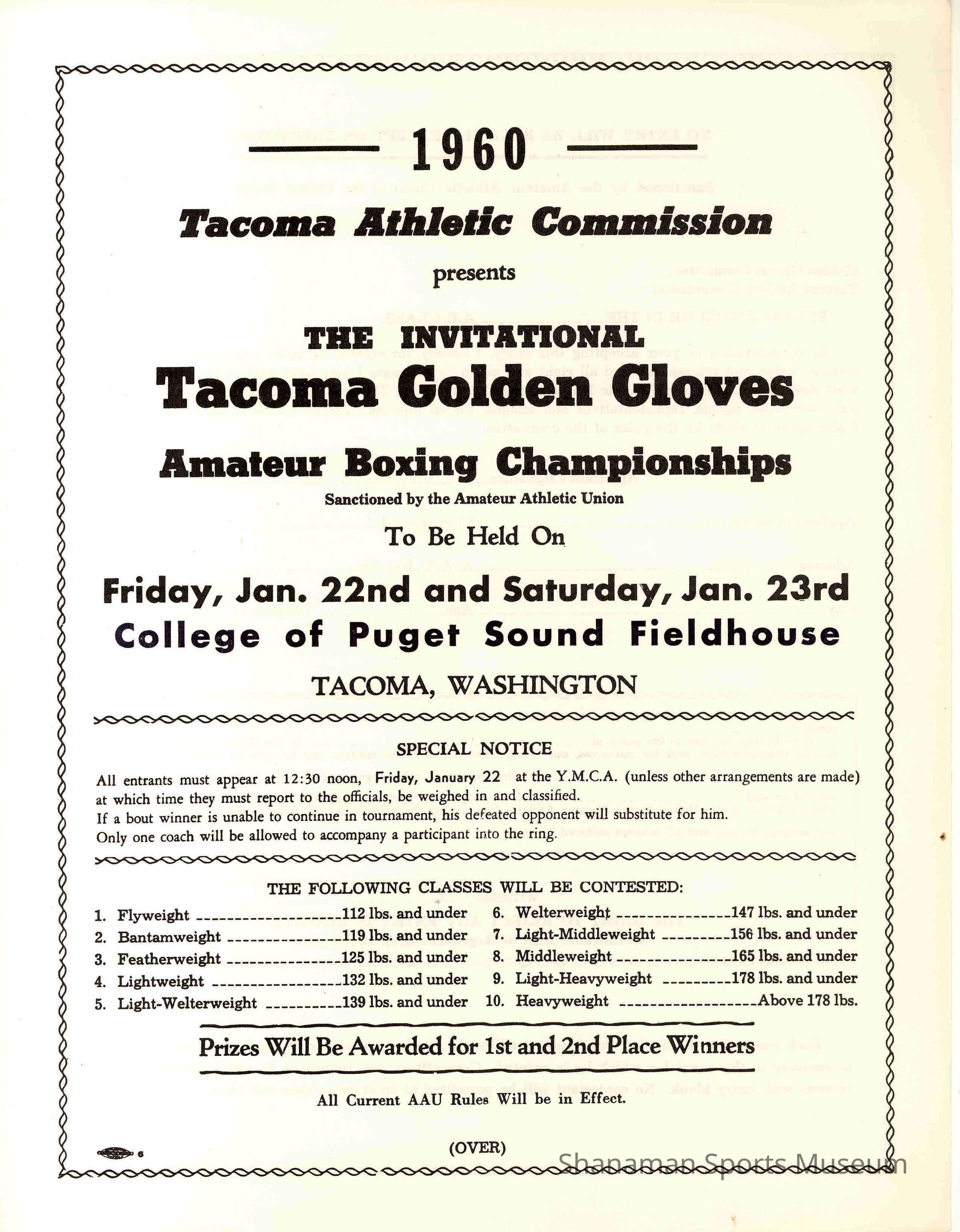 One page, double sided form for participation in the 1960 Golden Gloves. Front page details dates, times, and place Back has official applicants form and directionsLexicon