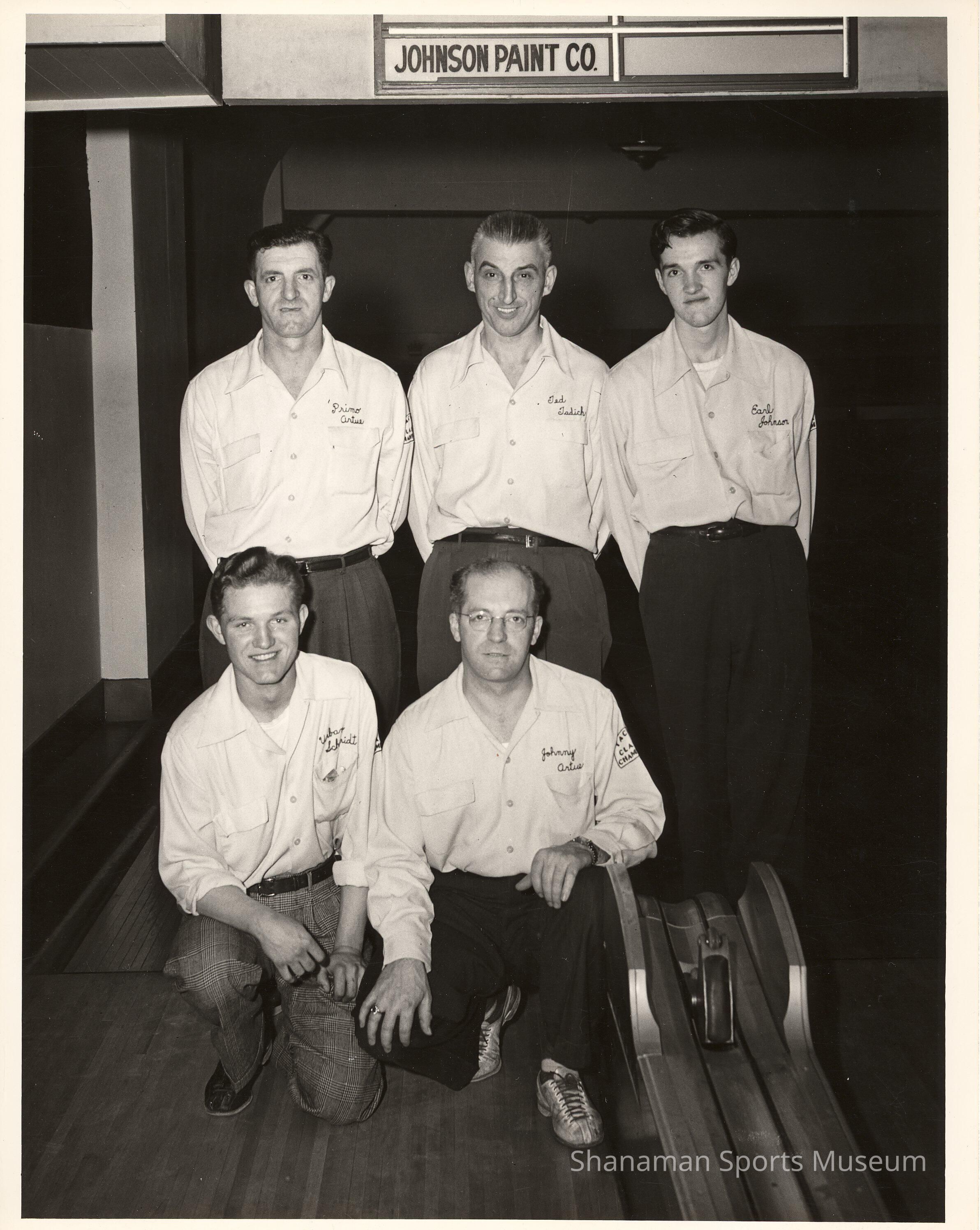 Five bowlers on the Johnson Paint Co. bowling team pose for a picture. In the front row from left to right, there is Urban Schmidt and Johnny Artoe. In the back row, there's Primo Artoe, Ted Tadich and Earl Johnson. In 1949, this team bowled in the American Bowling Congress Atlantic City tournament. Johnson was the first of Tacoma's two celebrated Earls of bowling. Earl Johnson and Earl Anthony were inducted into the American Bowling Congress Hall of Fame. Johnson won his first PBA title in 1960 in San Francisco. He's in the Tacoma Pierce County Sports Hall of Fame.