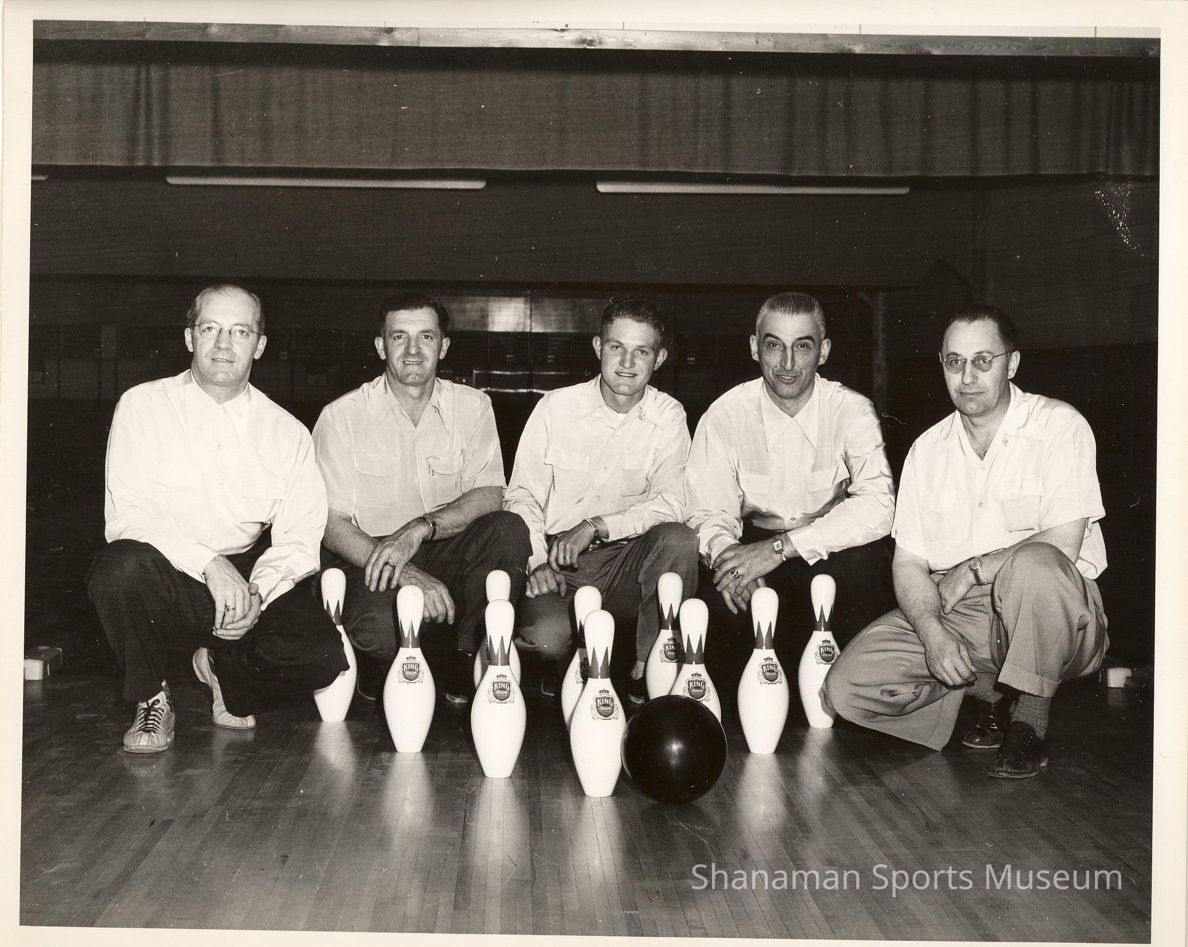 Five men on the Brewers Bowling Team kneel behind bowling pins and a bowling ball, smiling for this black-and-white photo taken in the 1950s. Bowlers in the picture are from left to right: Johnny Artoe, Primo Artoe, Urban Schmidt, Ted Tadich, and Bill McClelland. The photo was taken by Wayne Zimmerman. Leo Artoe, a brother of Johnny and Primo Artoe, played football at Lincoln High School in the early 1940s and went on to play professional football for the Los Angeles Dons in 1946.