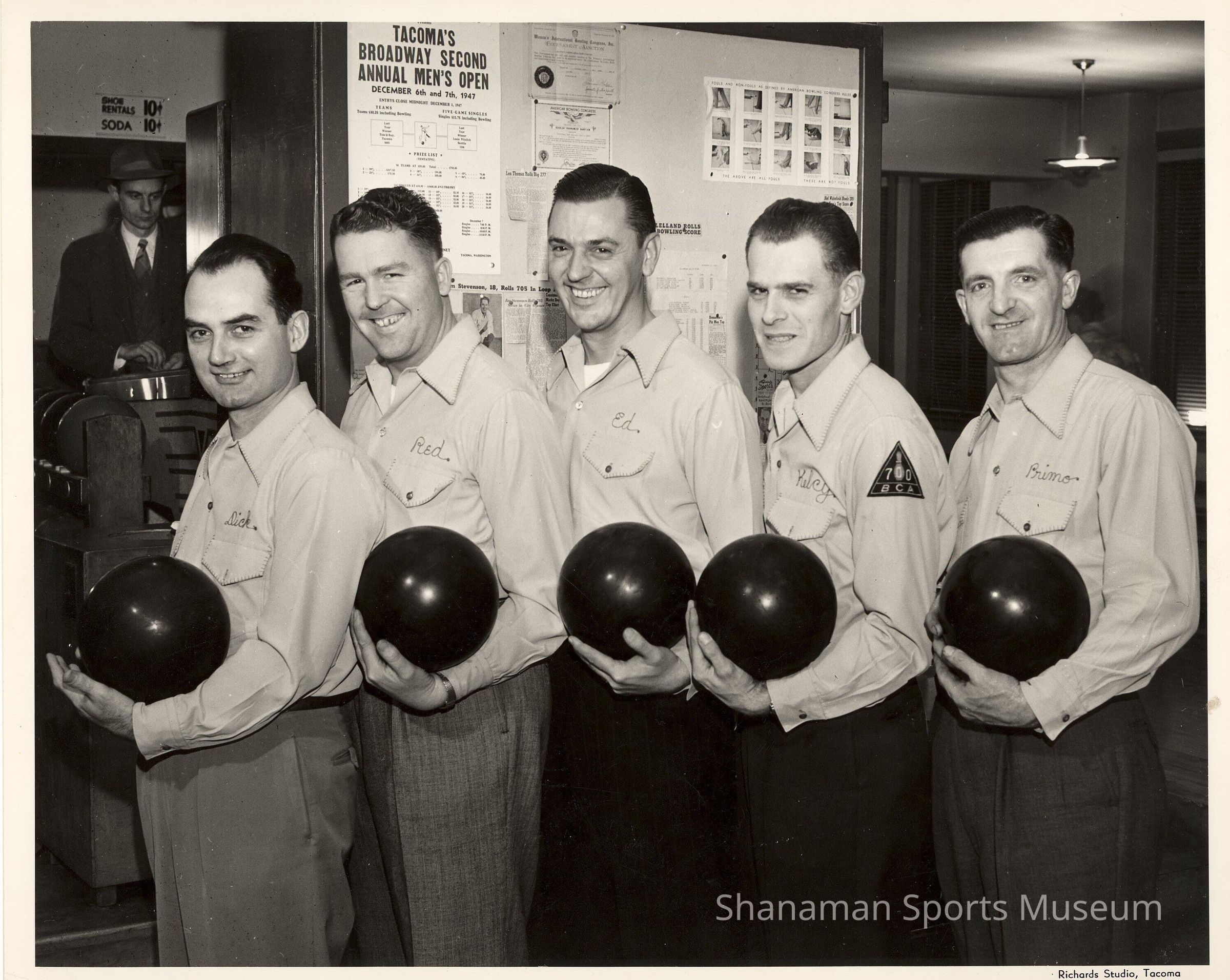 1947 Tacoma bowling team sponsored by the Tacoma Athletic Club. Standing from left to right are Dick McNerthney, Red Wakefield, Ed Valish, Kelcy Allen and Primo Artoe. Artoe was an avid bowler and bowled on a Tacoma team that completed in the American Bowling Congress tournament in Atlantic City in 1949. That team was the Tacoma Elks champions. In addition to being an outstanding bowler, Artoe was also a top notched pitcher for the North Pacific baseball team and his brother Leo played pro football for the Los Angeles Dons and the Chicago Bears.