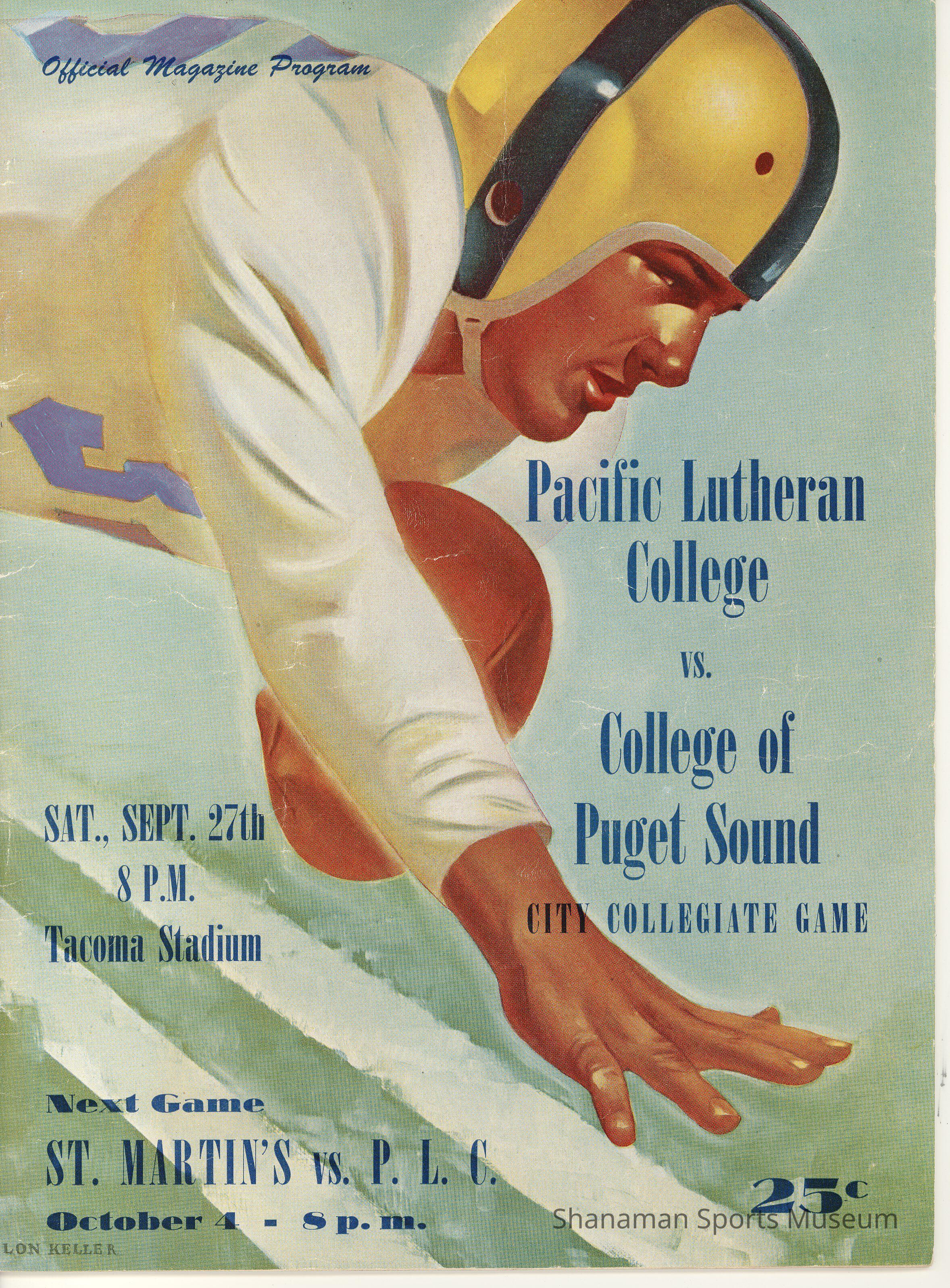 "Pacific Lutheran College vs College of Puget Sound, City Collegiate Game, Sat. Sept. 27th, 8 pm, Tacoma Stadium. 1947Lexicon