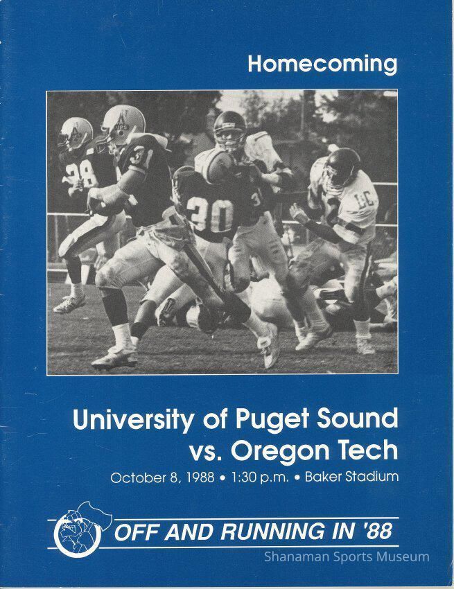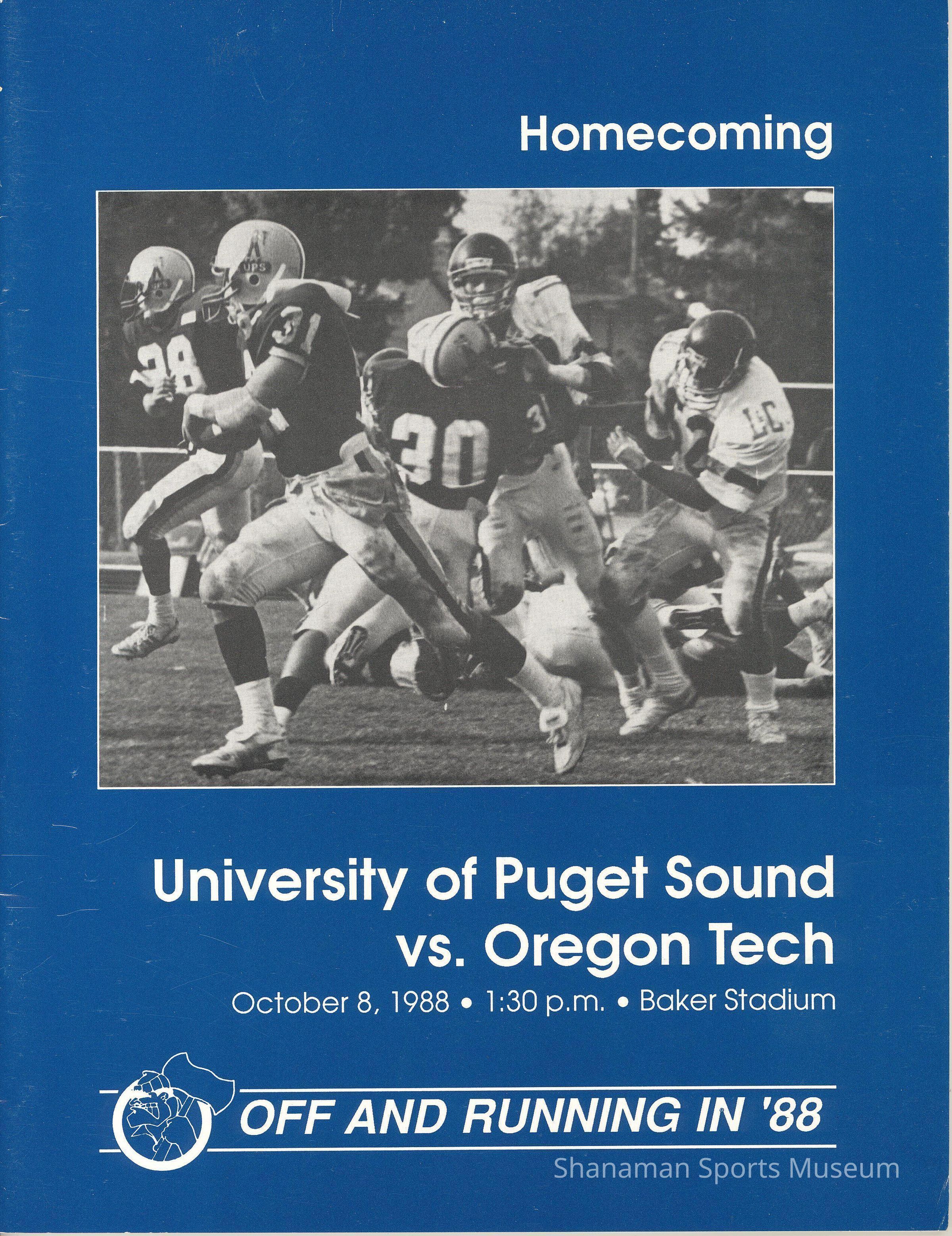 University of Puget Sound vs Oregon Tech, 10/8/88 at Baker Stadium. Homecoming Program. Blue cover