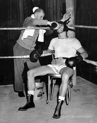 Pat McMurtry in corner of ring, drinking from bottle held by trainer, Homer Amundson.Relationships
