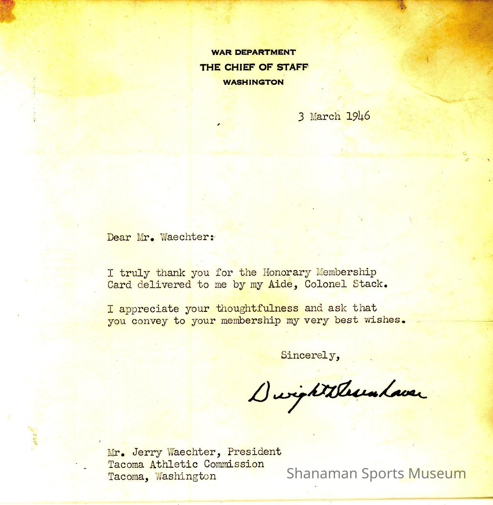 Typed letter to Jerry Waechter, pres of TAC, from "War Dep't, Chief of Staff". Signed Dwight D. EisenhowerLexicon