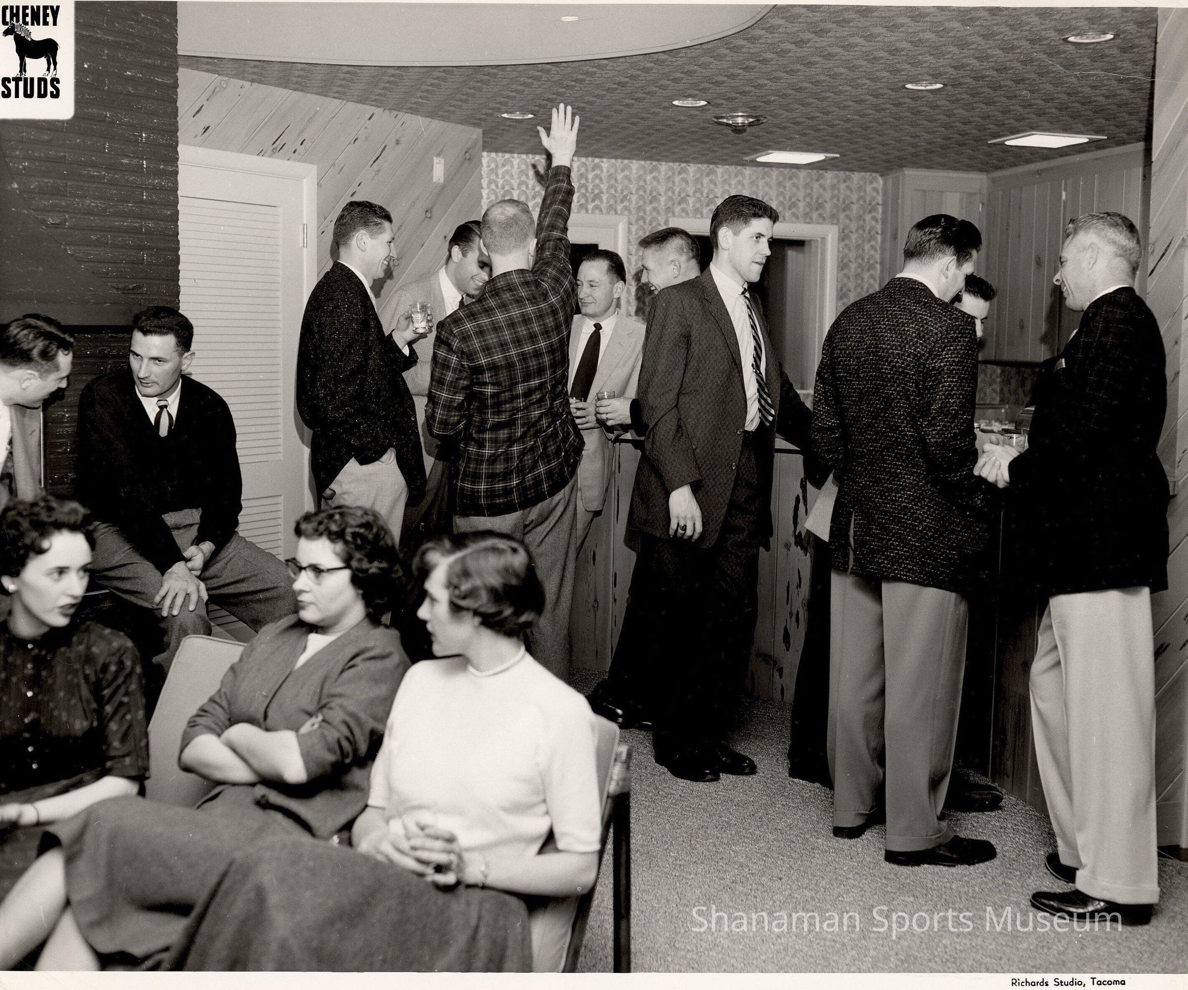 A photograph at one of Tacoma legend Ben Cheney's parties with Cheney Studs and their wives. Cheney held many social gatherings to celebrate his competitive sports teams as a way for the players and their wives to get together when the Studs weren't playing. This photo was taken shortly before Marv Harshman left Pacific Lutheran University men's basketball team to coach Washington State University men's basketball. Shortly after this photo was taken, Marv Harshman left coaching at Pacific Lutheran College to coach at WSU.