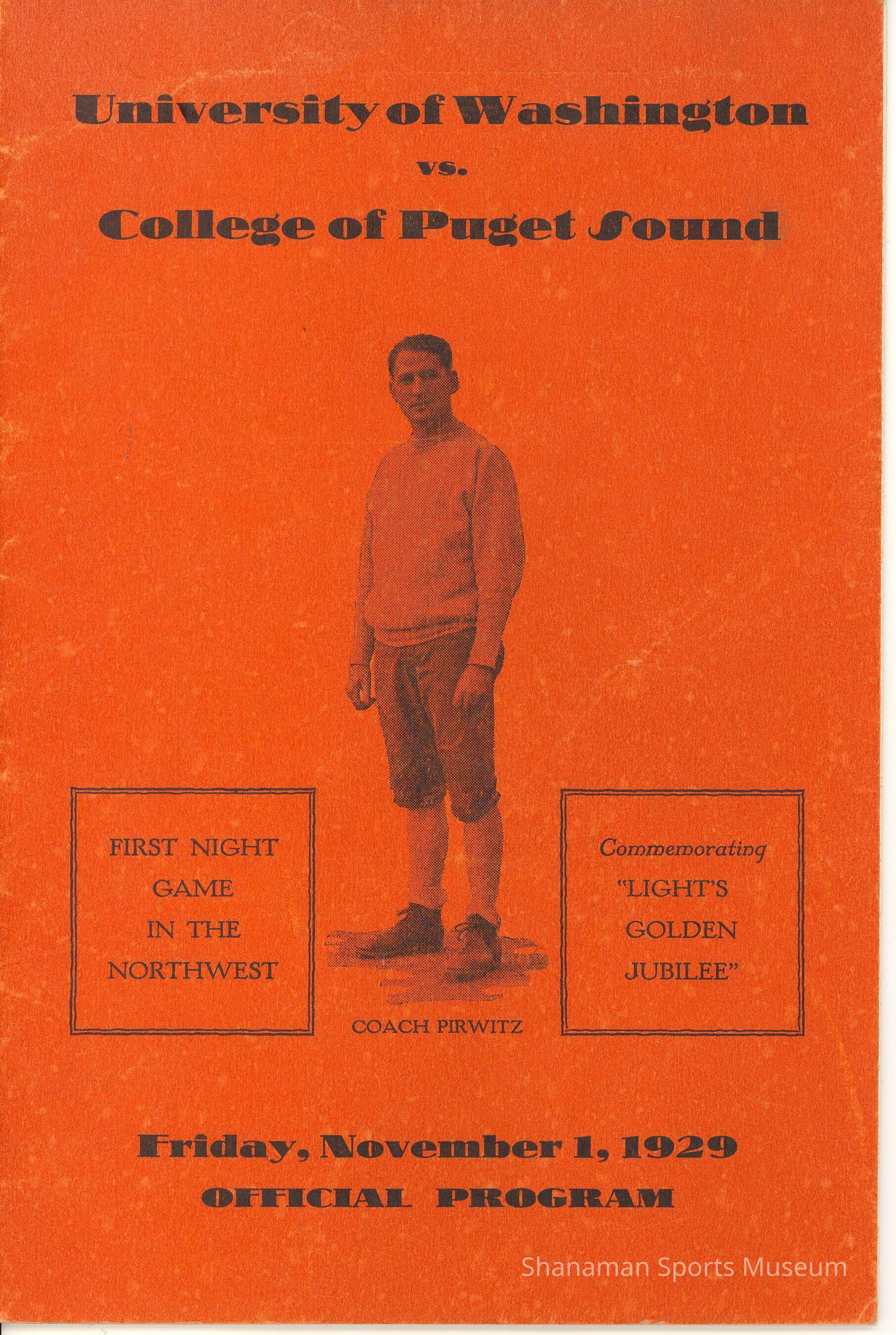 Official University of Washington vs College of Puget Sound, Fri, Nov. 1, 1929. Coach Pirwitz on orange cover.