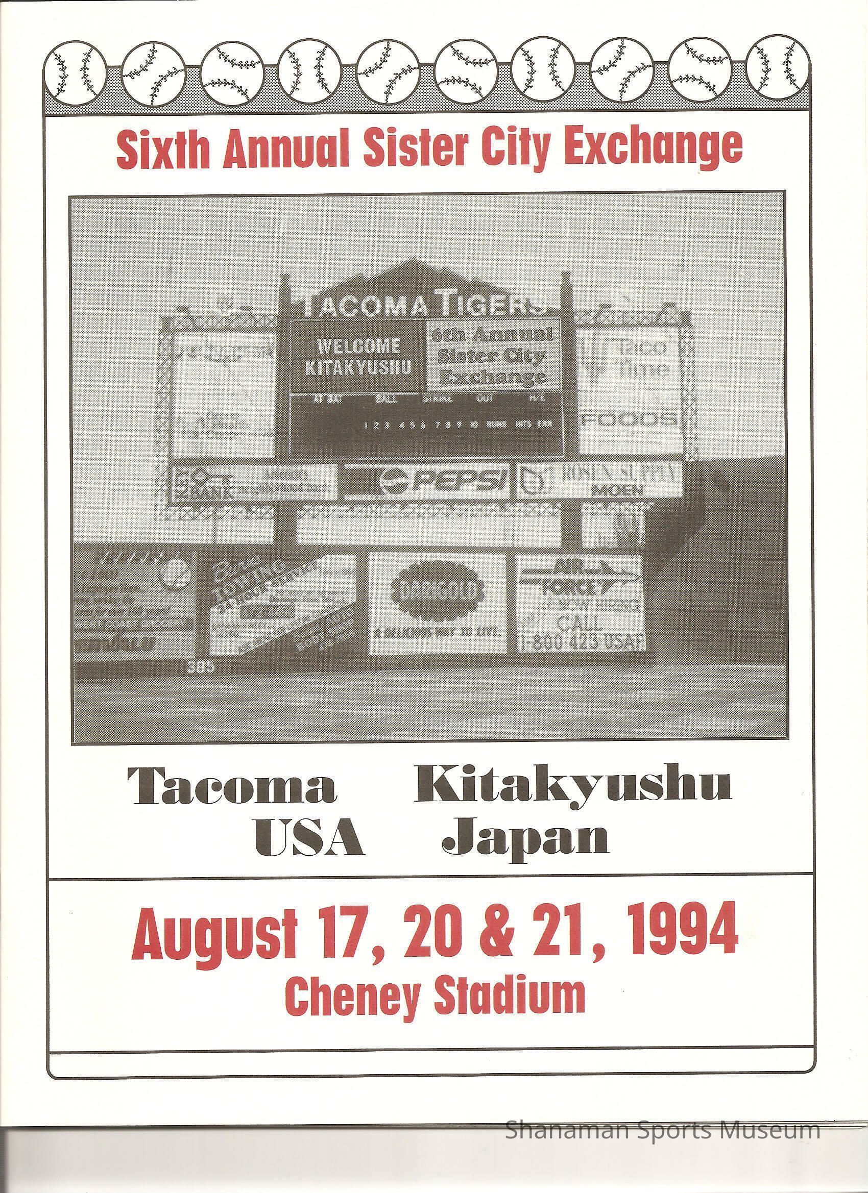 "Sixth annual Sister City Exchange" - Tacoma vs. Kitakyushu. Games held August 1994 at Cheney Stadium