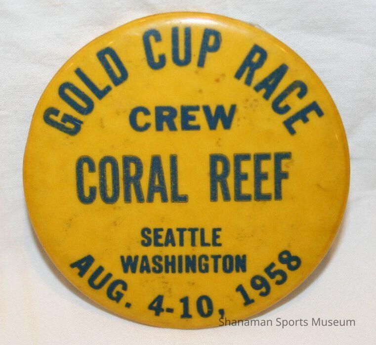 Commemorative pin -"Gold cup Race Crew, coral Reef Seattle Washington Aug. 4-10, 1958"; Participation in Seafair racesLexicon