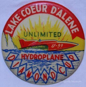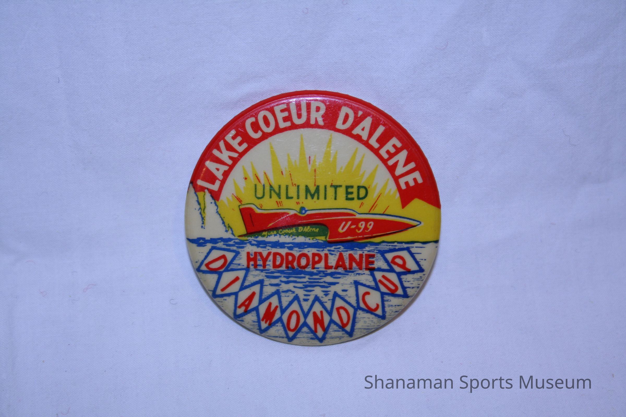 Commemorative button, "Lake Coeur D'Alene Diamond Cup - Unlimited Hydroplane" races. Silhouette of "U-99 Miss Coeur D'Alene" with sunsetLexicon