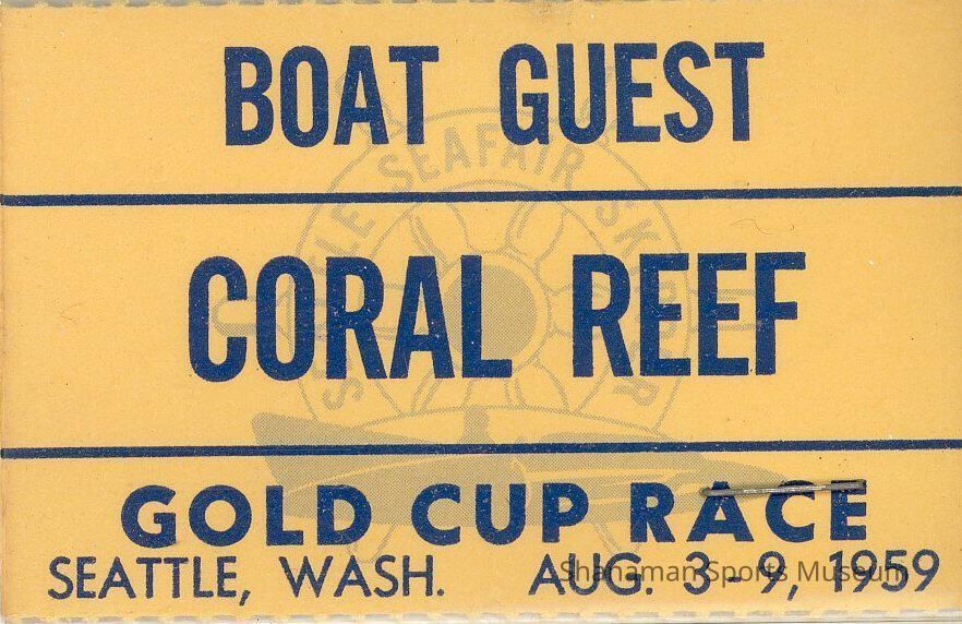 "Boat Guest Coral Reef - Gold Cup Race, Seattle Wash. Aug 3-9, 1959". Bold printing in blue ink on yellow card; Seafair emblem on card.Lexicon
