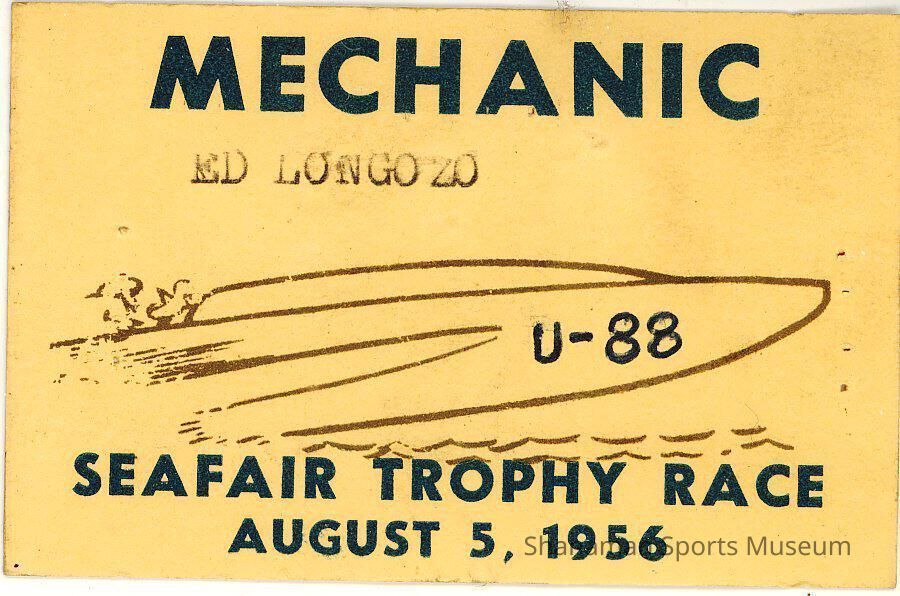 yellow card stock pass for "mechanic-SeaFair Trophy Race Aug 5, 1956"; printed in dark blue. "Ed Longozo" is typed under "Mechanic", "U-88" is written in ink on front end of hydroplane silhouette"Lexicon