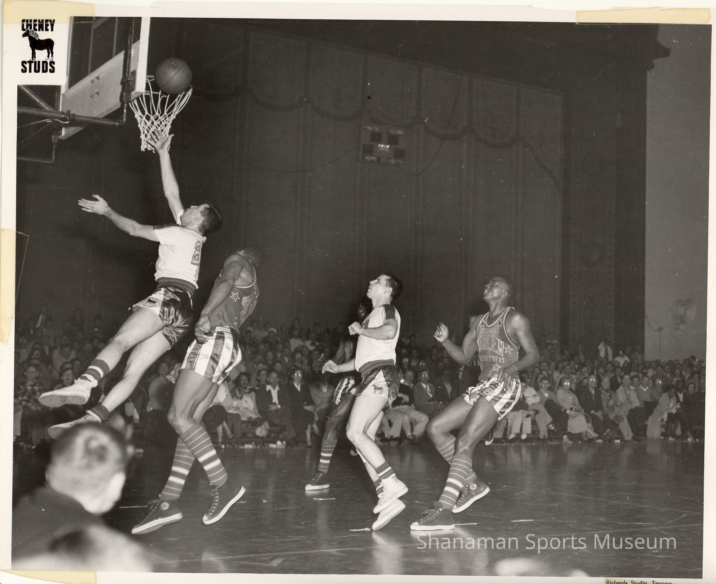 John O'Brien shooting a layup during a Cheney Studs basketball game against the "Original" Harlem Globetrotters. John, No. 22, was an All-American with Seattle University, and he played with his twin brother Ed, behind in the white jersey. Ben Cheney created the Cheney Studs as a way to showcase many of the top collegiate athletes during their off-seasons.Lexicon