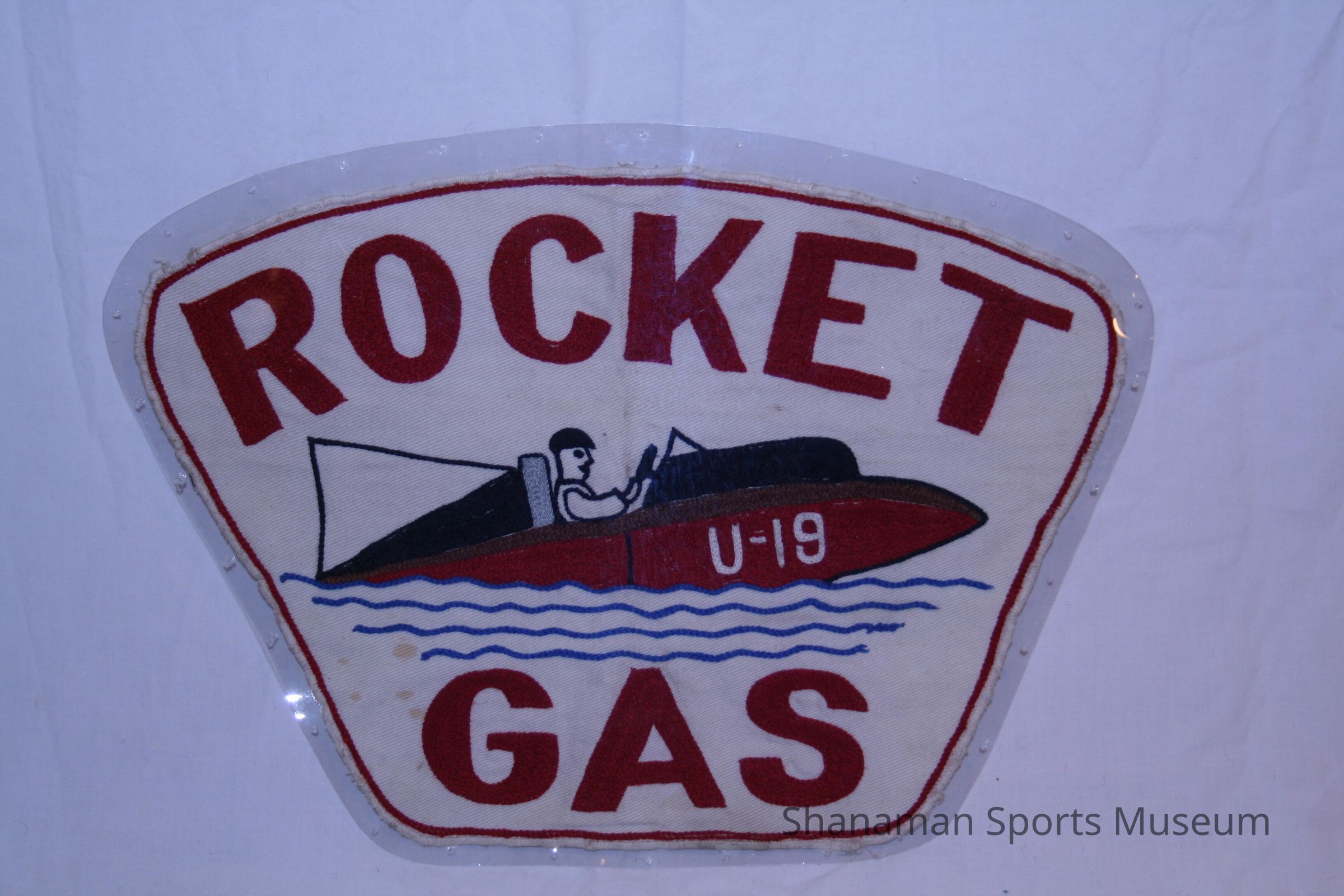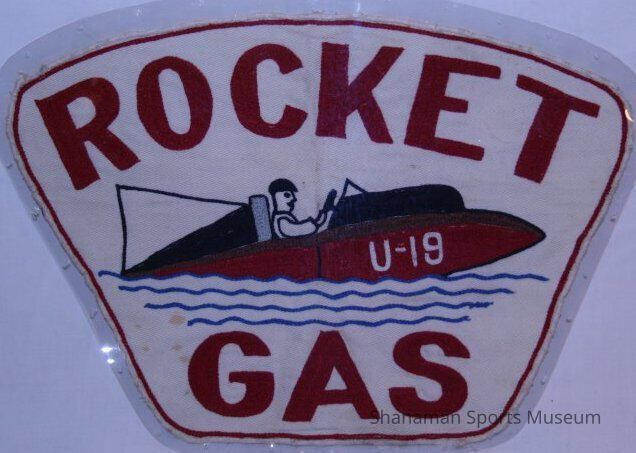 "Rocket Gas" patch worn on back of coveralls of mechanics who worked on Miss Rocket 1957. Patch has silhouette of hydroplane with driver in center of patch. "U-19" starboard