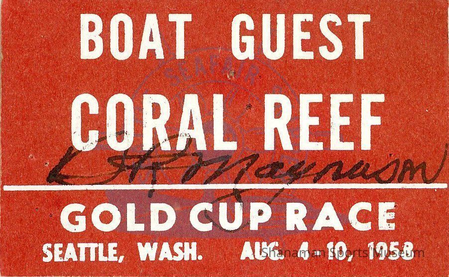 Pass - "Boat Guest - Coral Reef - Gold Cup Race, Seattle Wash Aug 4-10, 1958". Red background; Seafair emblem at center; Frank Woods a member of the pit crew.Lexicon