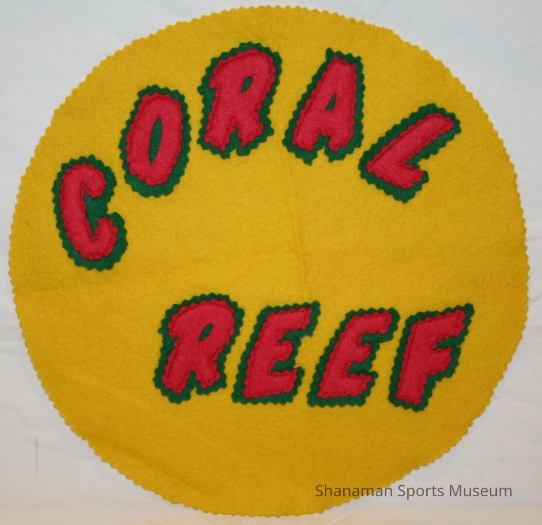 Round yellow felt patch, edged with zig-zag cut. "Coral Reef" in red letters with green border. Patch worn on coveralls of crew.