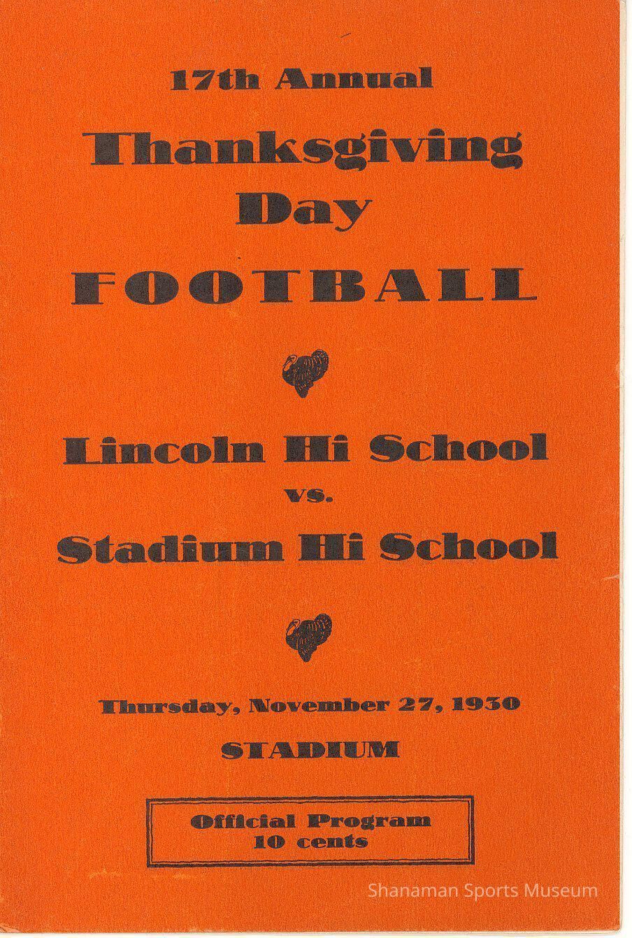 17th annual thanksgiving Day Football, Lincoln Hi. Vs Stadium Hi. Nov. 27, 1930. Inside write-ups and photos on coaches and teams; Lincoln team pictures Frank Stojack and Jerry Geehan.Lexicon