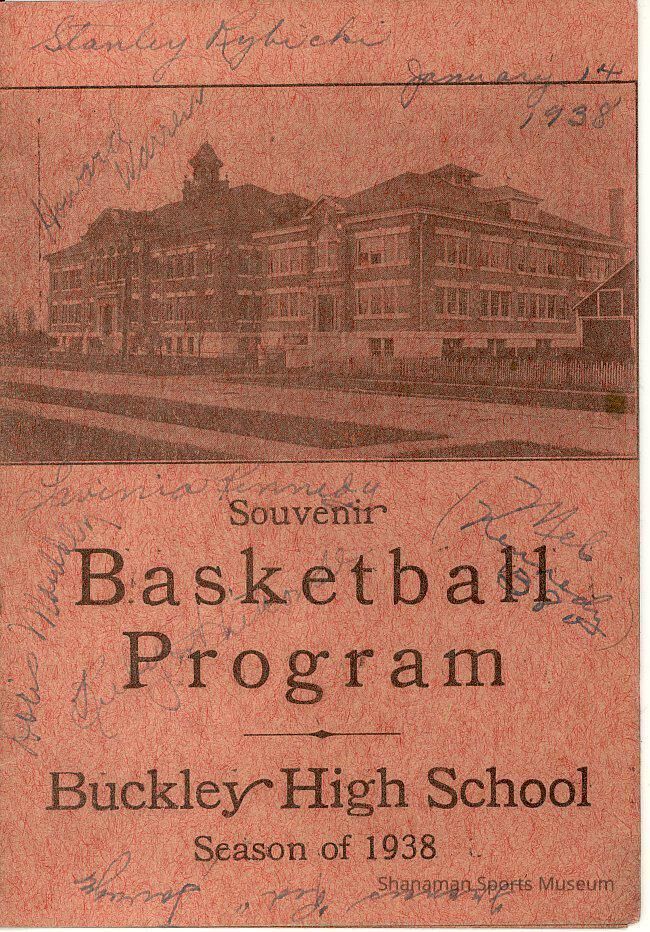 Bifold, cardstock basketball program for Buckley High School 1938 season. Many autographs on front cover and picture of school. Program for Fri Jan 14 gam vs Enumclaw.Lexicon