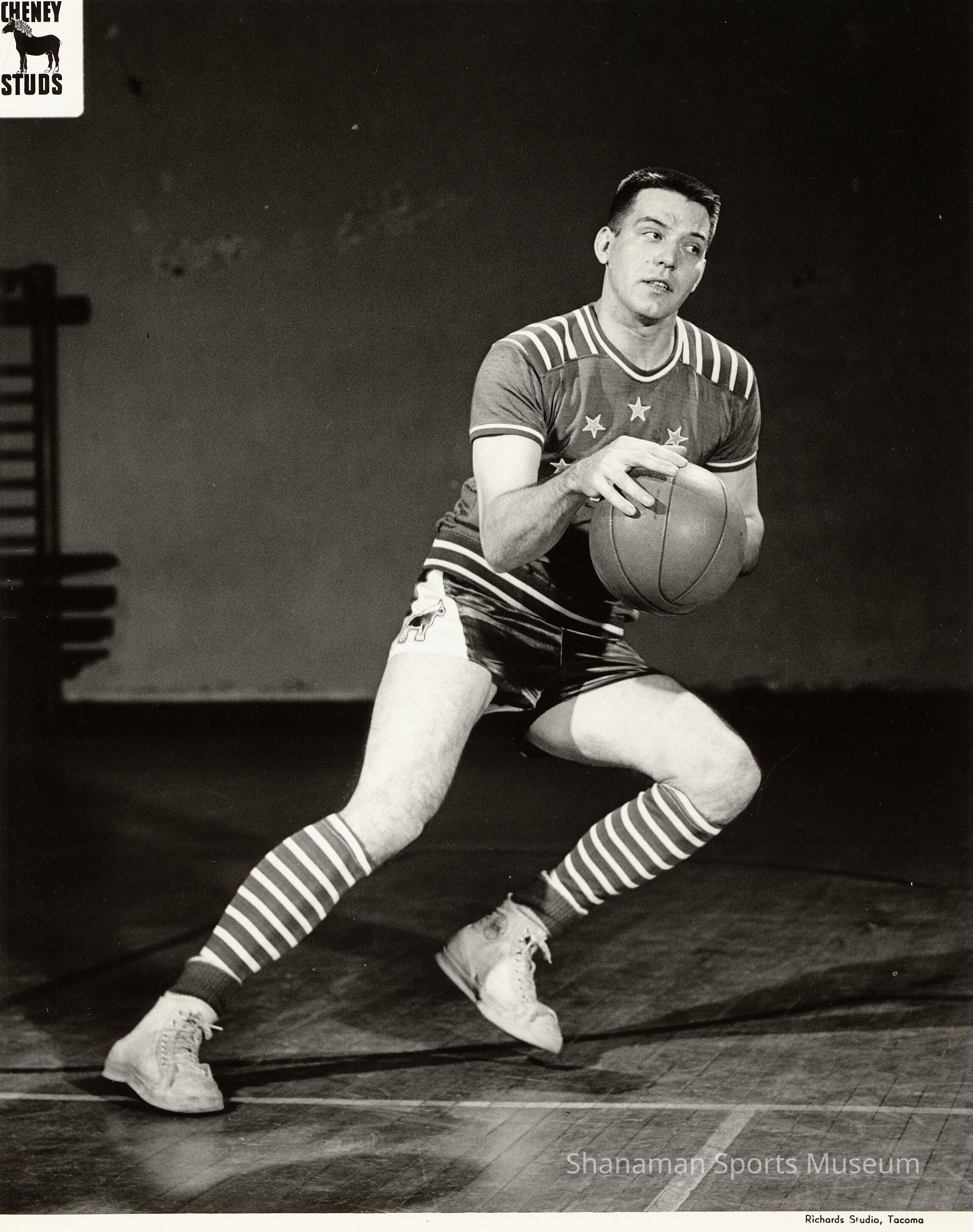 Burdette Thurlby receives a pass during a Cheney Studs photo shoot. Ben Cheney created the Studs as a way to showcase many of the top collegiate athletes in the nation's skill sets during their off-seasons. Former players and coaches went on to become some of the most influential coaches and officials in Washington state history after their time playing with the Studs.Lexicon