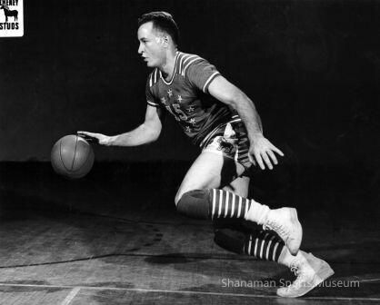 Dean Nicholas dribbling a basketball during a Cheney Studs photo shoot. Nicholas went on to coach the Puyallup High School Vikings football team, and then the Tacoma Mountaineers after playing for the Studs. Many of the Cheney Studs former players and coaches had productive coaching and officiating careers in the state of Washington.Lexicon