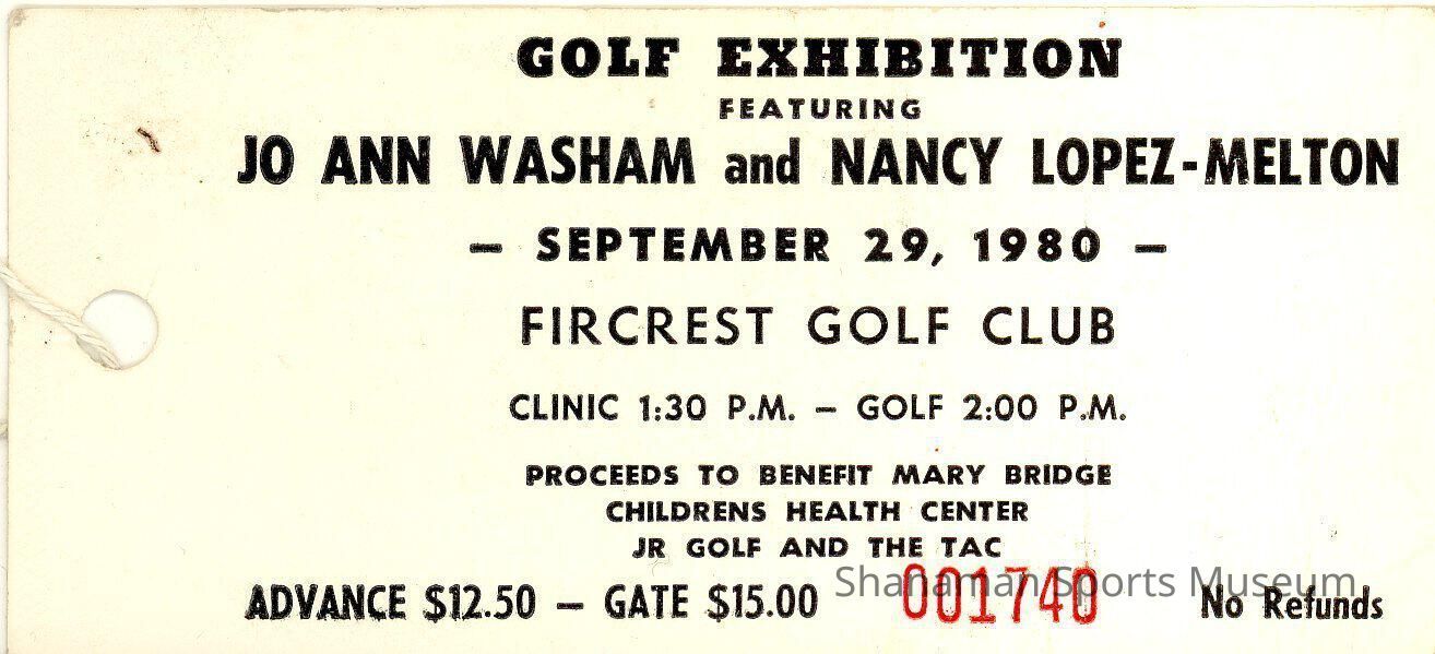 Ticket for Golf Exhibition featuring JoAnn Washam & Nancy Lopez-Melton. Sept 29, 1980 @ Fircrest Golf course. Ticket no. 1790.
