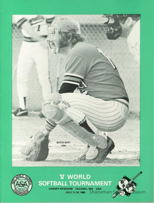 V World Softball (Fastpitch) Tournament program held @ Cheney Stadium July 11-19, 1980. Kelly green border, catcher Butch Batt on frontLexicon