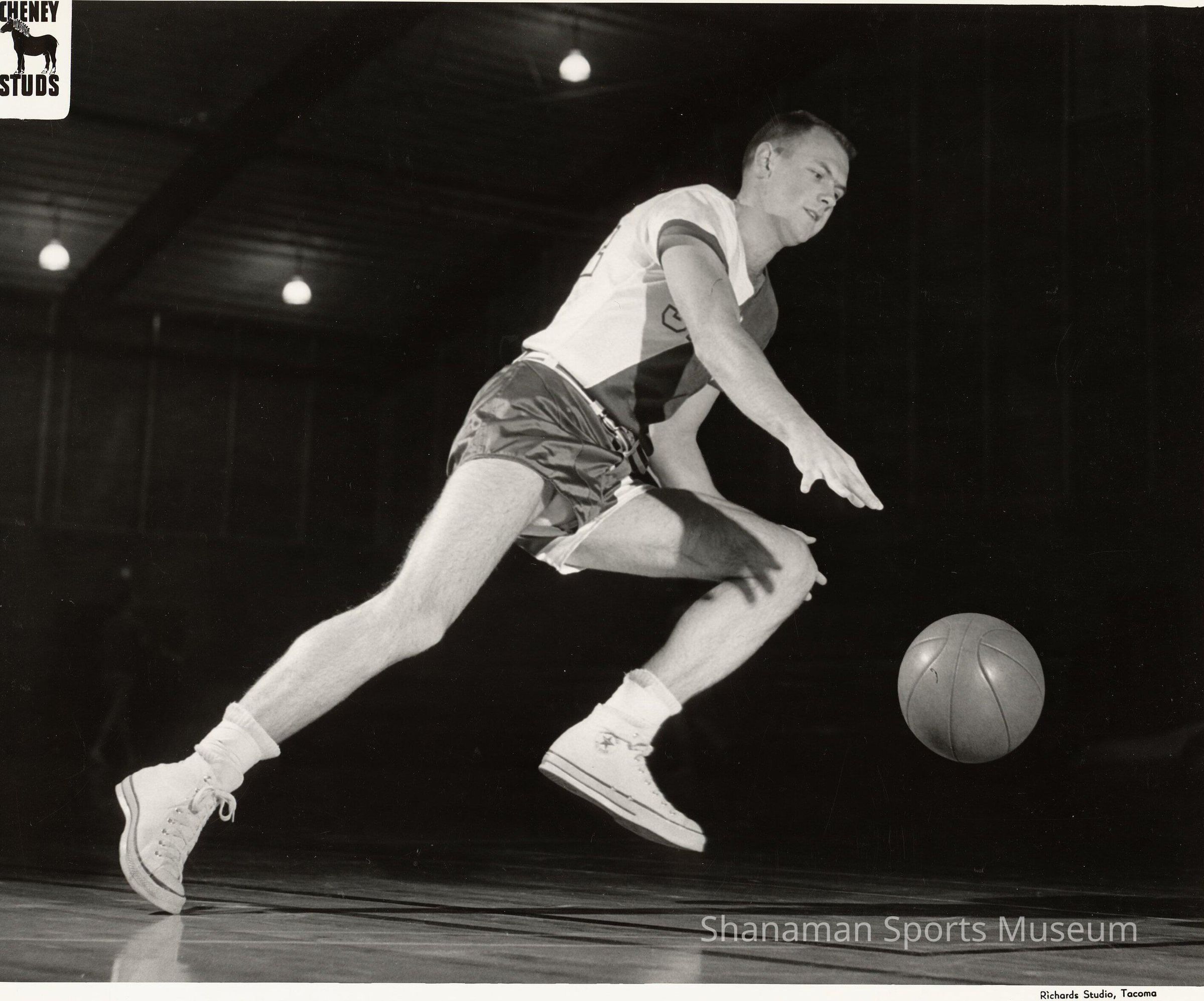 Dean Roffler dribbling during a Cheney Studs photo shoot. Roffler played for Eastern Washington University, and like many of the players, he used the Cheney Studs to showcase his talent during the off-season. Many of the former Studs players and coaches went on to become some of the most prominent coaches and officials in Washington state history.Lexicon
