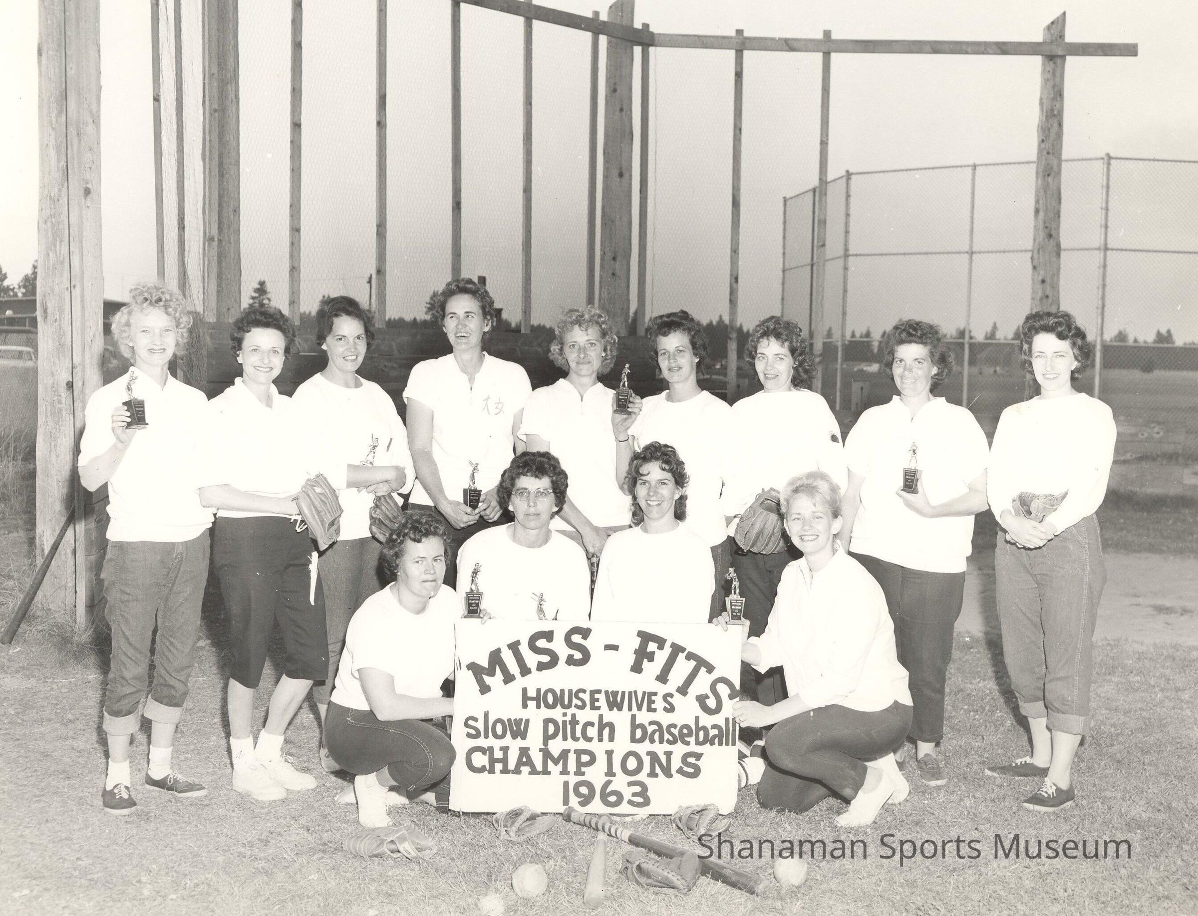 Original b/w team photo, Miss-Fits Housewives slow pitch baseball team, Champions 1963, players in white shirts hold trophies and a Miss-Fits sign. Della Esau back row second from rightLexicon