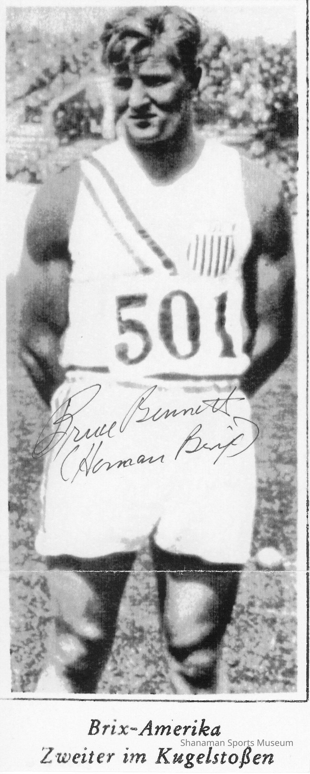 Tacoma's Herman Brix signed a color photocopy of a sepia-toned photo from the 1928 Summer Olympics in Amsterdam with "Bruce Bennett (Herman Brix)."