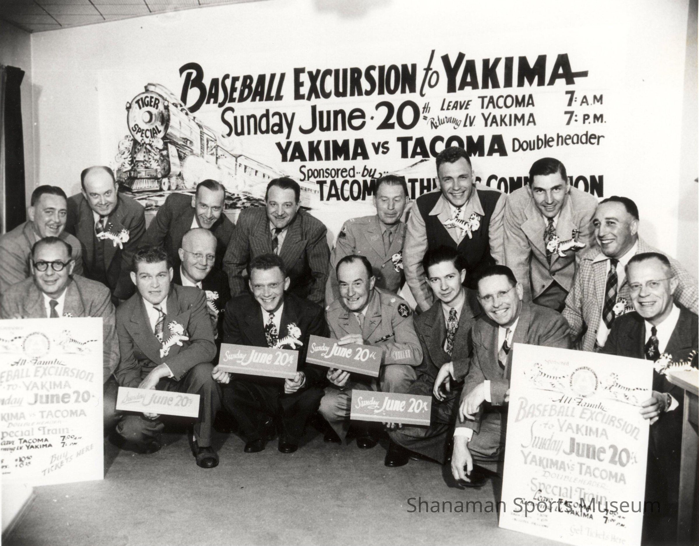 With paper tigers pinned to their lapels, 16 men dressed in suits kneel in front of a painted sign that says, “Baseball Excursion to Yakima.” The Tigers had a doubleheader at Yakima on this weekend that was back in the 1950s. Some of the men are: (back row, third from left) Jim Peterson; (fourth from left) Dill Howell; (sixth from left) Dick Beckman; (eighth from left) Frank Gillihan. (Front row, second from left) Steve Pease. In 1949, Gillihan was the Tacoma Athletic Commission's president. Howell was the owner of Dill Howell's sporting goods store in Tacoma and he was a strong supporter of local sports. Peterson was the TAC president in 1952 and was a longtime board member.