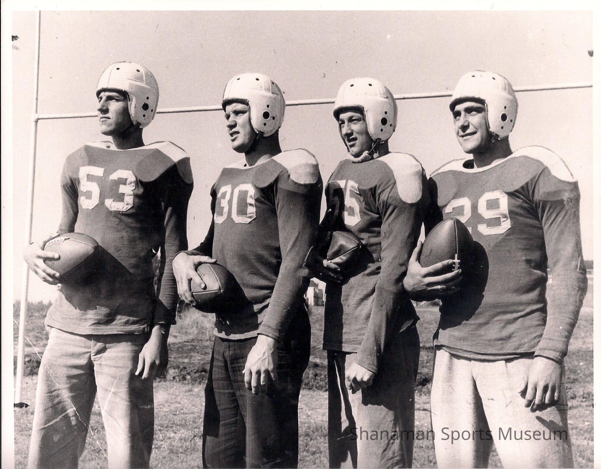 Al Greco (29) and three Bellarmine Prep football teammates pose for a photo in the late 1940s.Lexicon