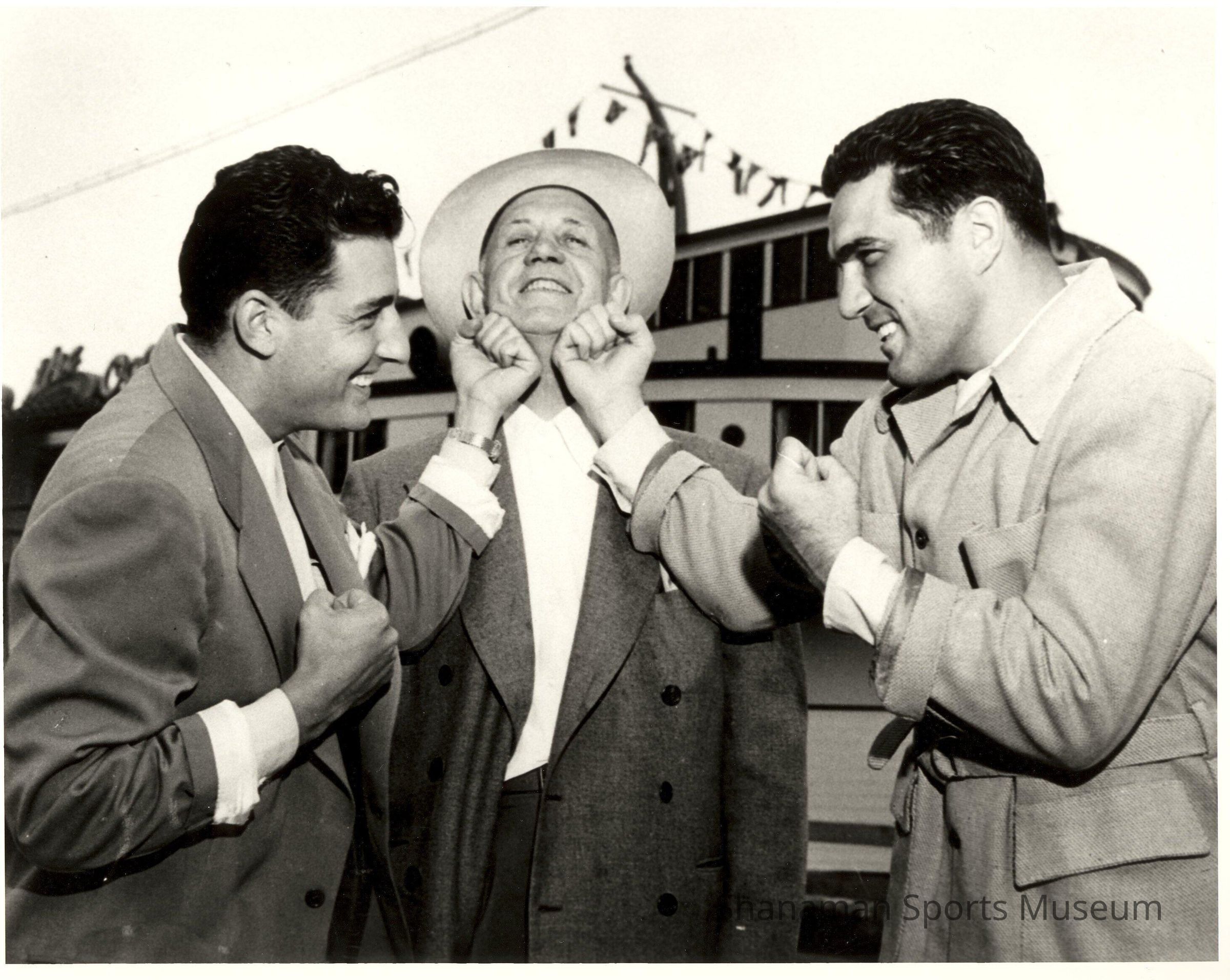 Heavyweight boxing champion Rocky Marciano, on the right, pretends to punch Jack Kearns, a fight promoter, on the chin. Marciano held the heavyweight boxing title for four years from 1952 to 1956 and he is the only boxing champion to retire undefeated. Known for his relentless fighting style, he had six successful title defenses. Kearns, who was nicknamed “Doc” and lived in Washington, was most famous for managing Jack Dempsey, the world heavyweight champ from 1919 to 1926.Lexicon