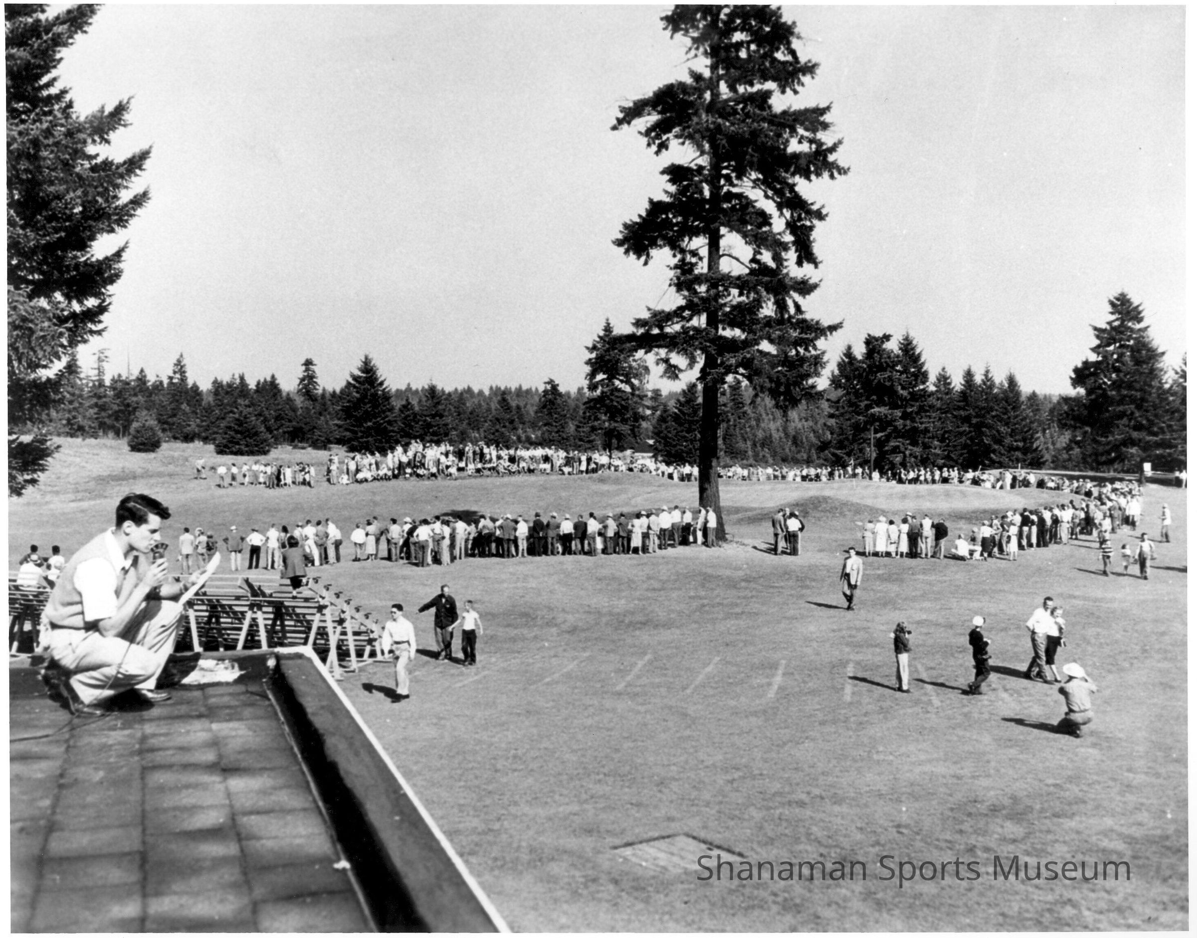 A black and white photograph with a wide shot of the crowd watching on at the Fircrest Tacoma Open at the Fircrest Golf Club. The course was built in 1923 by architect Arthur Vernon Macan, an Irish emigrant who came to the Northwest when he immigrated to Victoria in 1912. Macan designed many courses in the Pacific Northwest and British Columbia. The Tacoma Open was a short-lived professional golf tournament on the PGA Tour that took place in 1945 and 1948.Made/Created