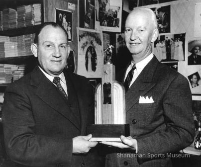 Baron Barosky, PLU Asst Football Coach (left), and Howard Smith holding trophy between themLexicon