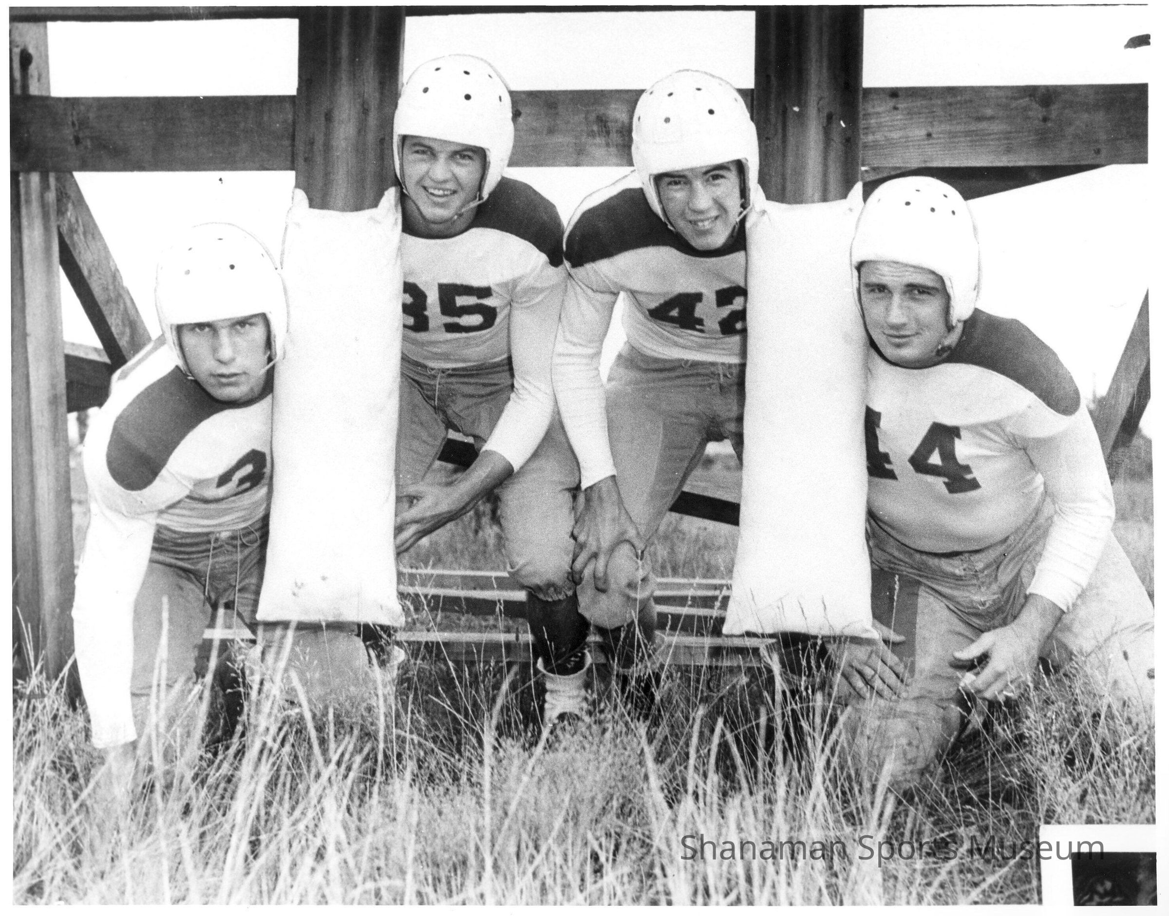 Clover Park High football players (from left) Louie Wymer, Mel Light, Bill Stringfellow and Reid Ponton pose by a blocking sled in a grassy field in 1946.